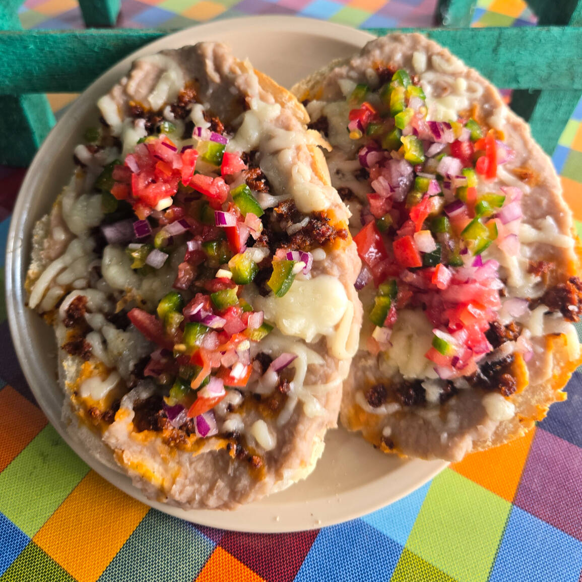 Pan telera con frijoles refritos con chorizo y queso asadero, acompañados de pico de gallo