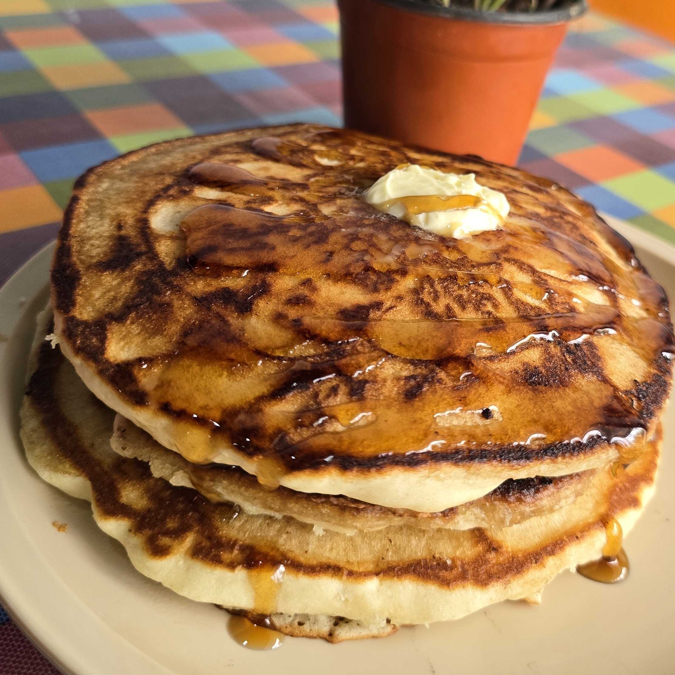 3 esponjosos hotcakes con mantequilla y miel de maple