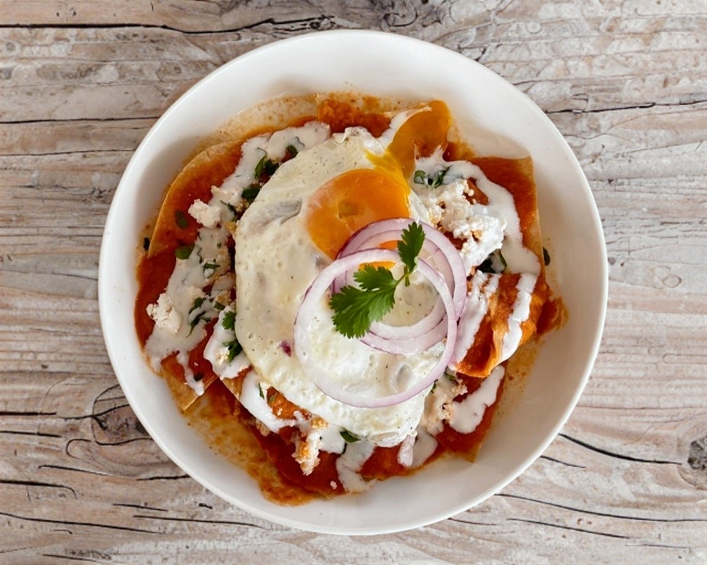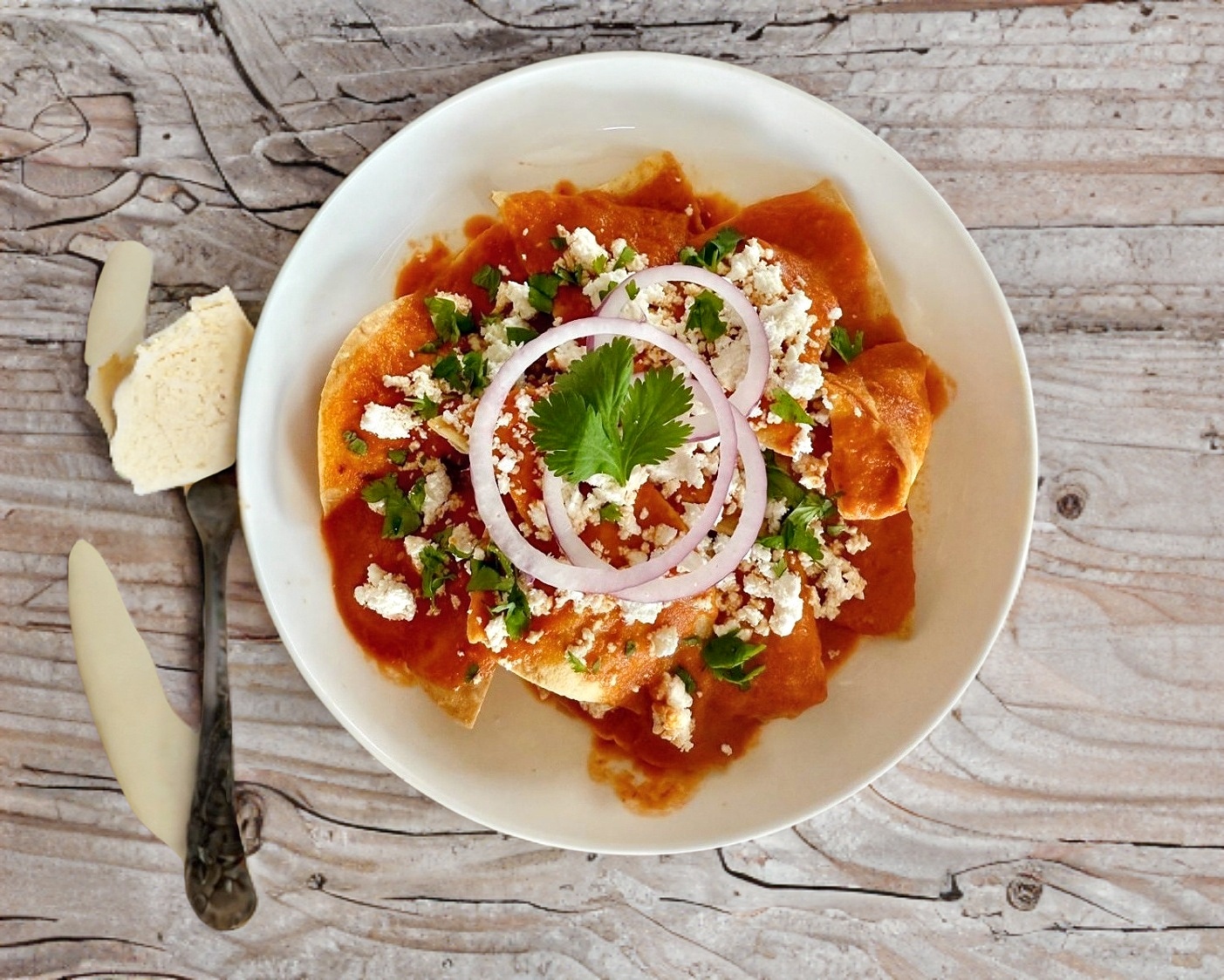 chilaquiles tradicionales en salsa roja con frijoles ,crema,cebolla morada, queso y cilantro.