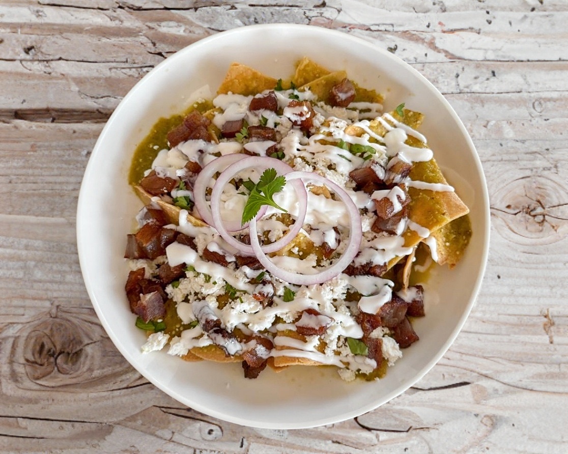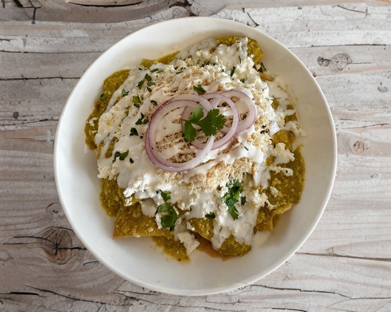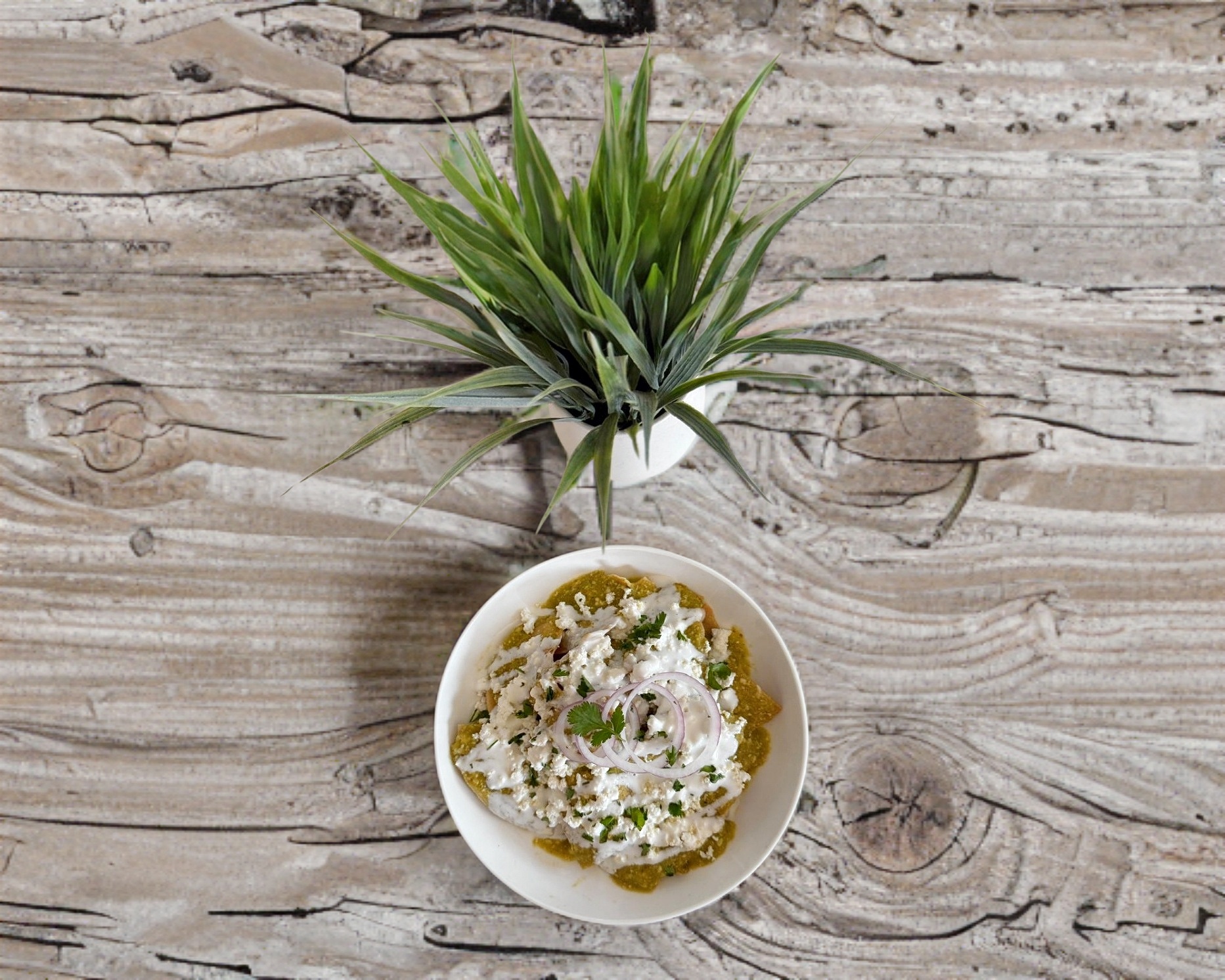 chilaquiles tradicionales en salsa verde con frijoles ,queso , crema,cebolla morada y cilantro