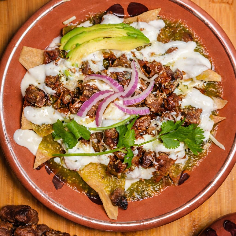 Chilaquiles crujientes de totopos de maíz, acompañados de arrachera seleccionada y queso fundido, servidos sobre frijoles refritos y cubiertos con crema, cebolla morada, aguacate fresco y un toque de cilantro.