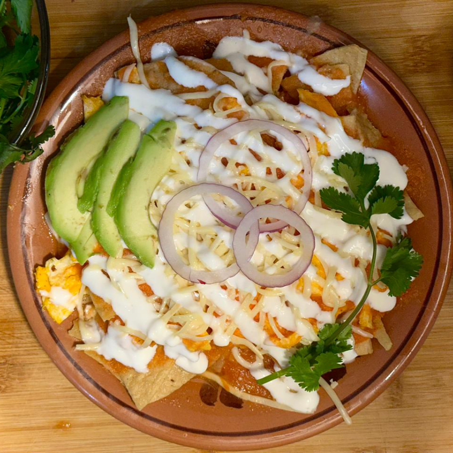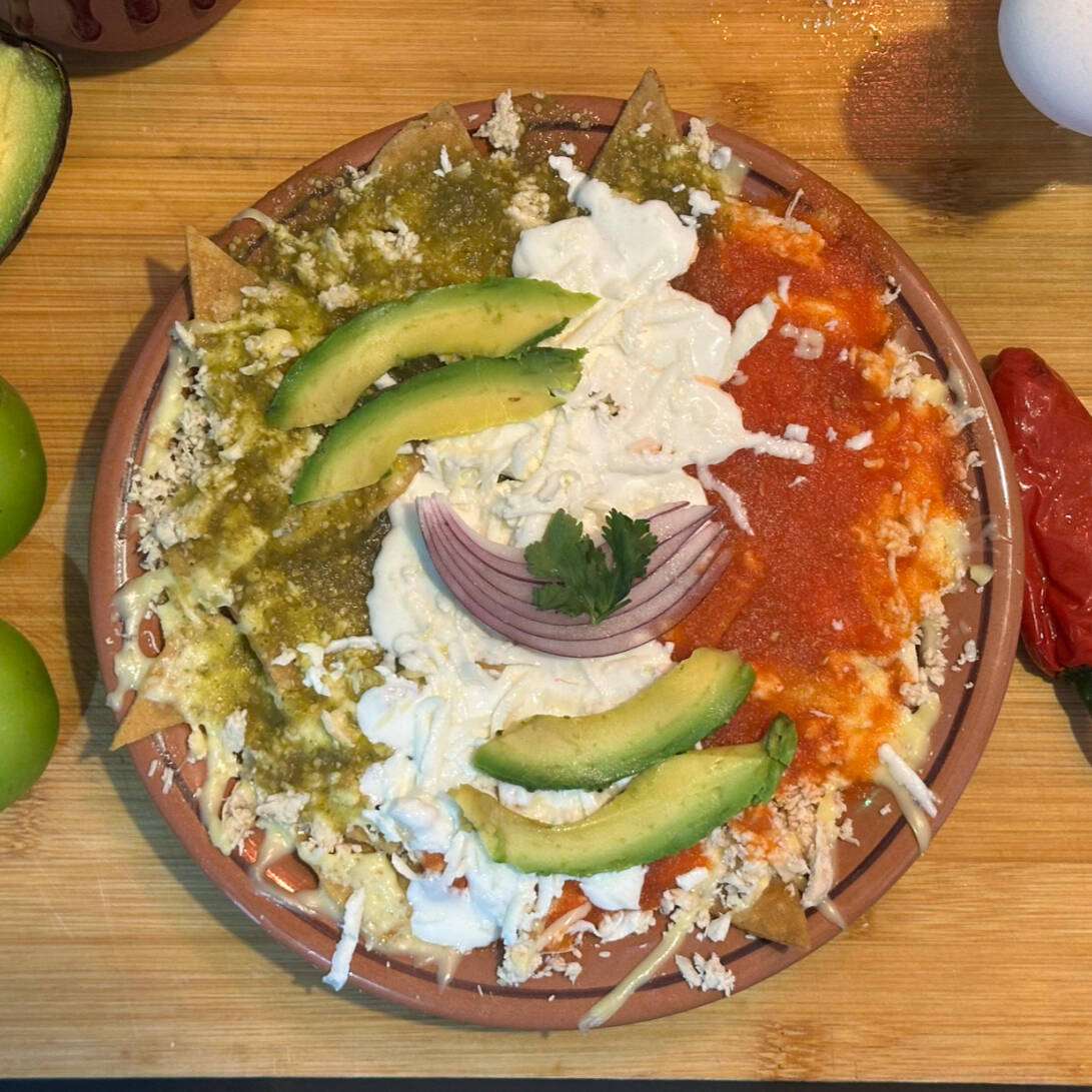 Crujientes láminas de maíz bañadas en salsa artesanal de la casa, servidas sobre una cama de frijoles refritos, coronadas con pechuga de pollo deshebrada, queso manchego gratinado y aguacate fresco, acompañadas de crema, cebolla morada y un toque de cilantro fresco.