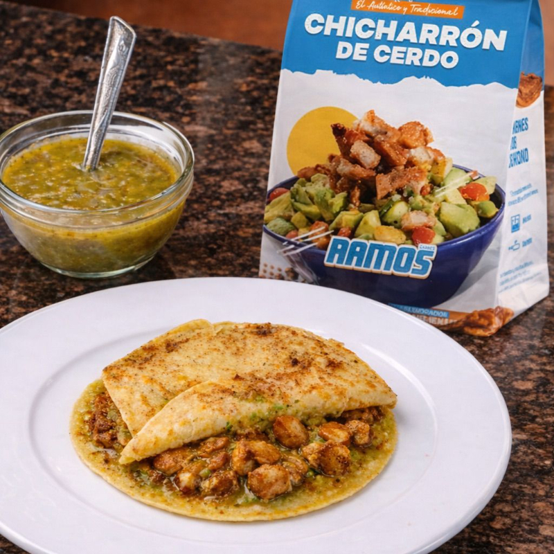 Tortilla de maíz doradita rellena de frijoles, queso y chicharrón de cerdo guisado en salsa verde, con un toque casero y bien sazonado. Acompañado de salsa verde aparte para que lo disfrutes a tu gusto.