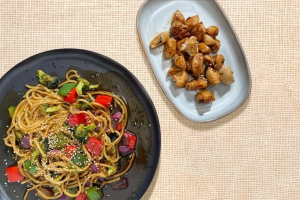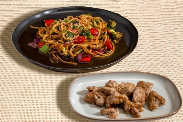 Pasta udon salteada con vegetales (cebolla y pimientos), salsa oriental, pollo, cebollín y ajonjolí. (400 gr aprox).