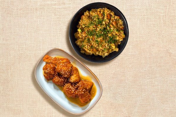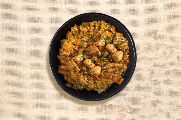 Arroz blanco salteado con pollo agridulce, vegetales (cebolla y pimientos), ajonjolí y cebollín. (450 gr aprox).