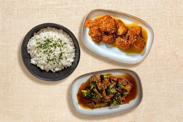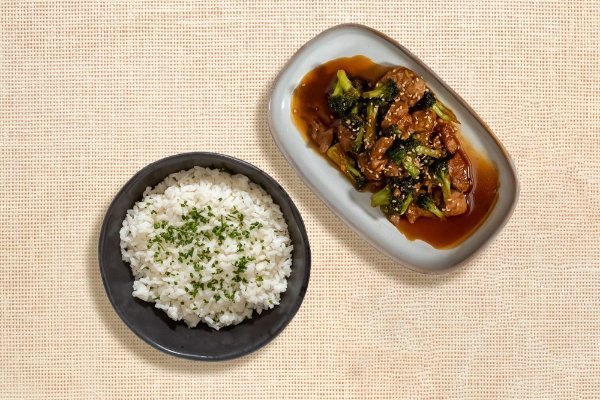 Arroz blanco con arrachera de res salteada en salsa oriental, brócoli, ajonjolí y cebollín. (470 gr aprox)