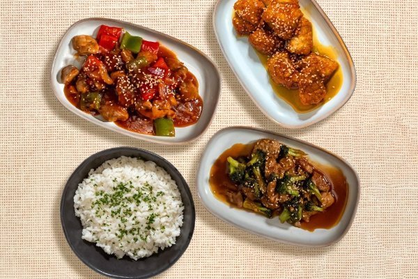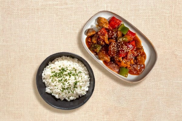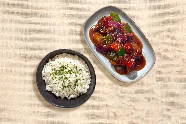 Arroz blanco con arrachera de res en salsa agridulce, salteada con vegetales (cebolla y pimientos), ajonjolí y cebollín. (470 gr aprox)