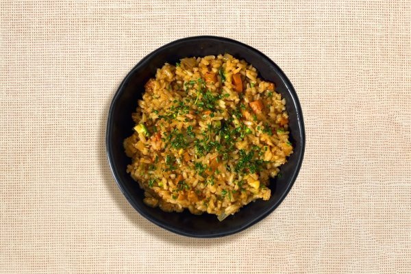 Bowl de arroz frito con vegetales (zanahoria, cebolla, zucchini), pollo, ajonjolí y cebollín. (410 gr aprox)