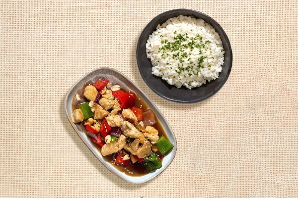 Arroz blanco con pollo, maní y vegetales (cebolla y pimientos) salteados en salsa oriental, ajonjolí y cebollín. (470 gr aprox)