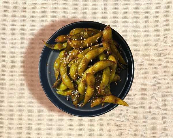 Edamames con vaina salteados con nuestra salsa macha, ponzu y ajonjoli. Viene con salsa ponzu aparte. (100 gr).