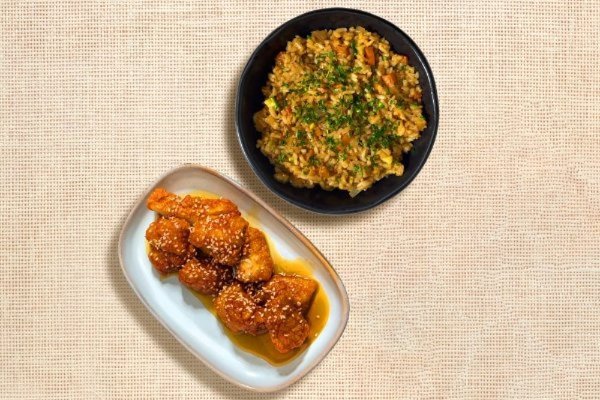 Arroz frito con pollo parrillado en salsa de naranja. (450 gr aprox)
