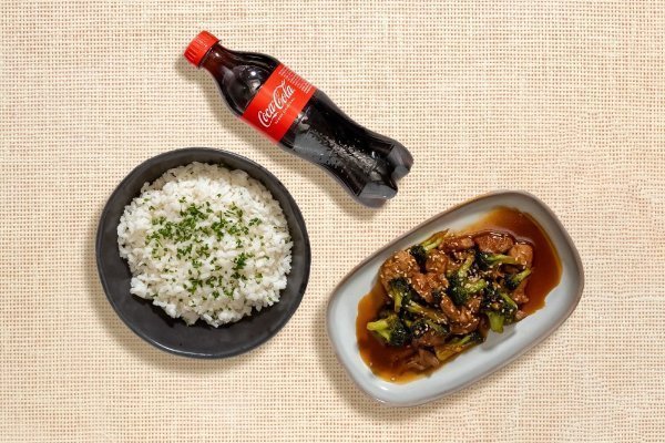 Bowl con Arroz Blanco y cubos de carne salteados con brócoli y salsa oriental. Acompañados de ajonjolí y cebollín + Coca cola. (210 gr aprox)