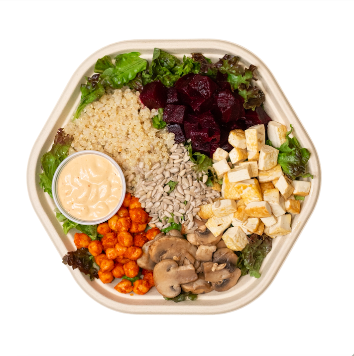 Mix de lechugas, quinoa, garbanzo, betabel, champiñones, tofu, semillas de girasol y aderezo spicy cashew