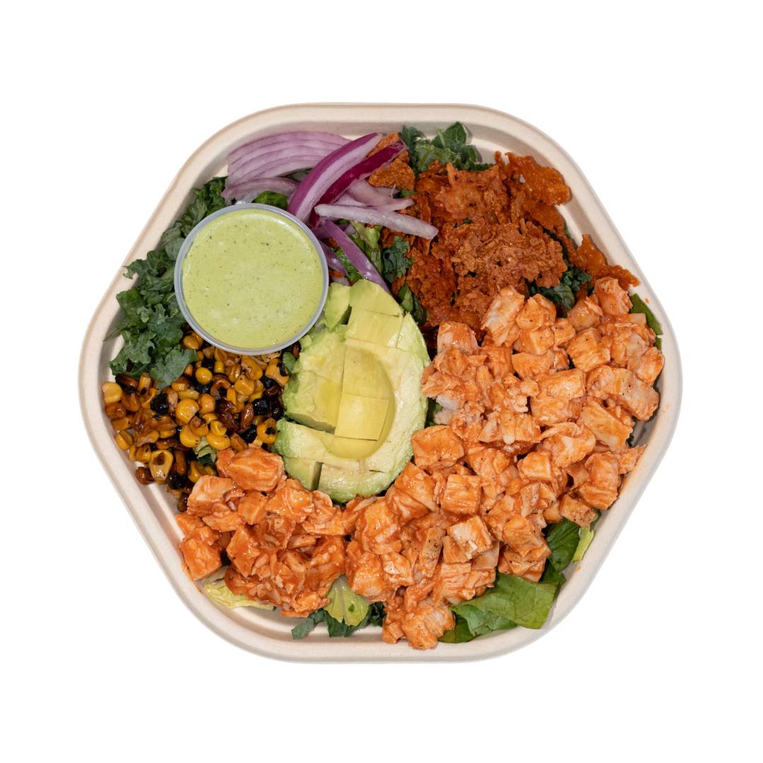 Lechuga orejona, kale, parmesan crisp, cebolla morada, elote asado, aguacate, 200 gramos de pollo y creamy cilantro