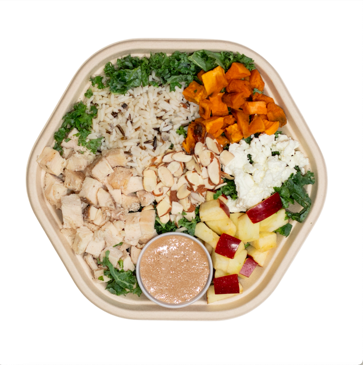Kale, arroz salvaje, camote, manzana, queso de cabra, pollo (100 gramos), almendra fileteada y vinagreta balsámica
