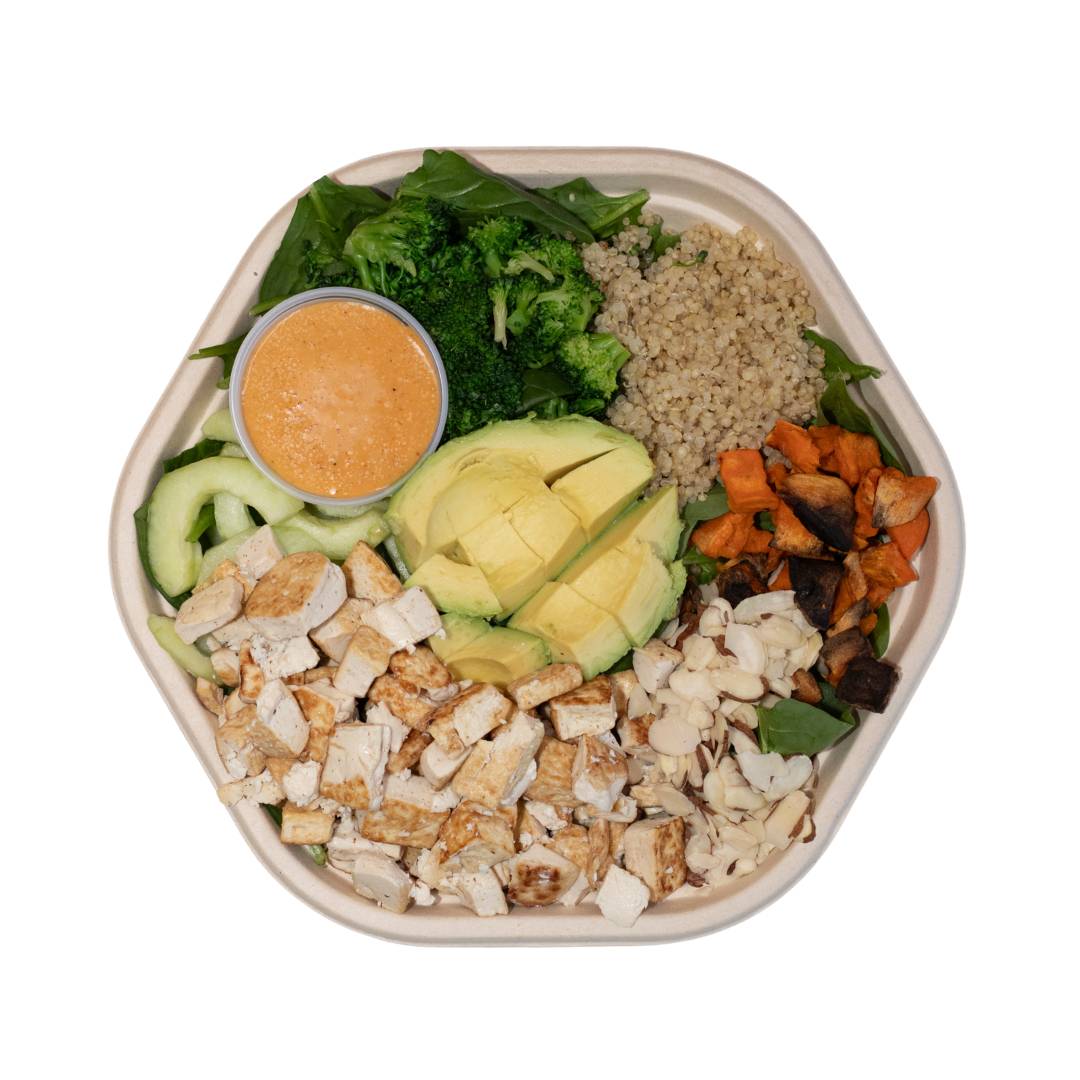 Espinaca, quinoa, brocoli, pepino, almendras, camote, aguacate, doble porcion de tofu, vinagreta sesame ginger