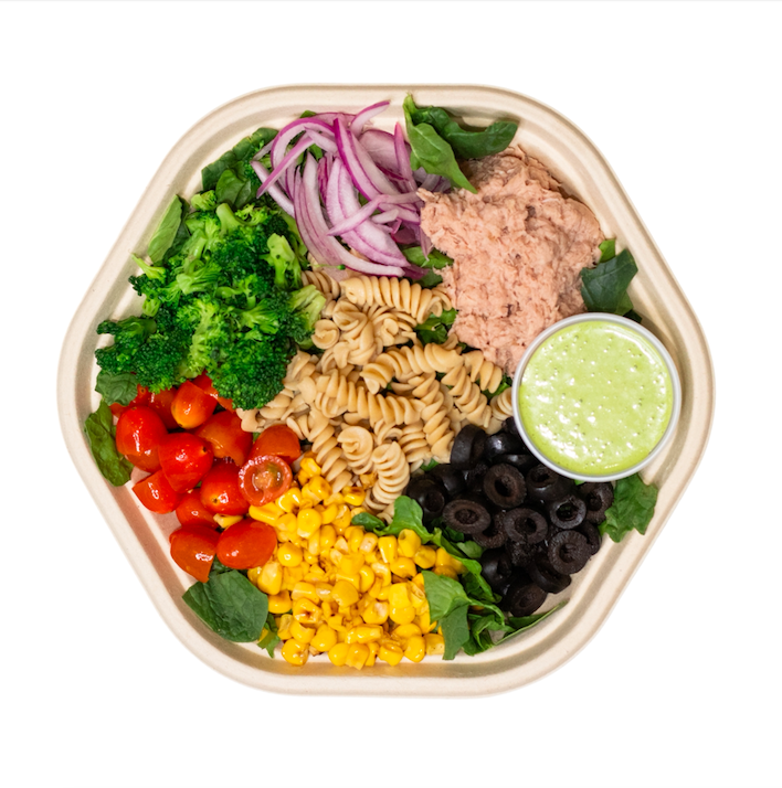 Espinaca, pasta integral, tomate cherry, cebolla morada, brócoli, elote asado, aceitunas y atún. Aderezo creamy cilantro