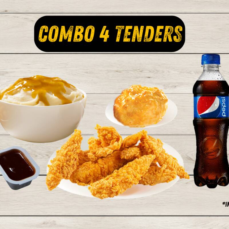 4 tenders + complemento mediano 6oz + biscuit + refresco mediano 16oz + aderezo