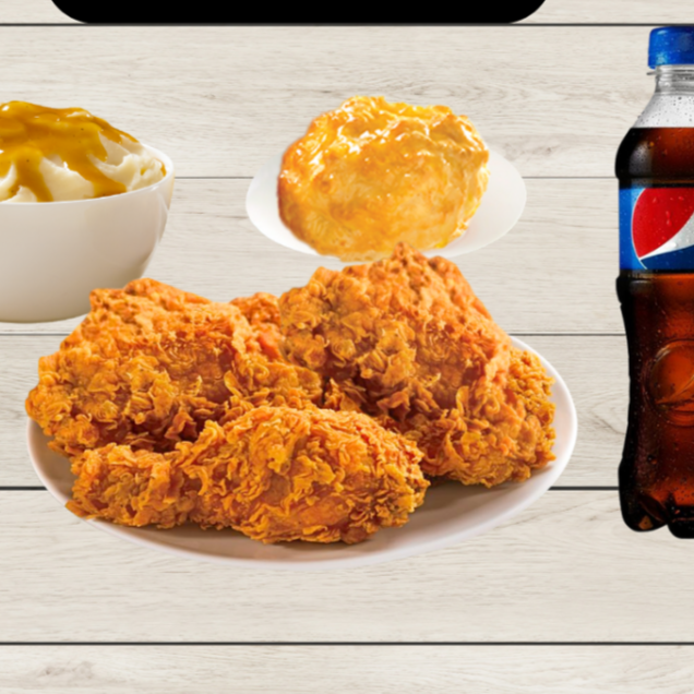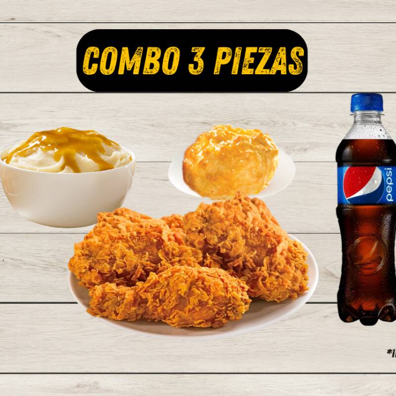 3 piezas + complemento mediano 6oz + biscuit + refresco mediano 16oz
