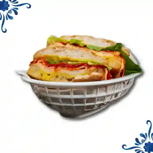 Chapata artesanal con queso gouda, queso Monterrey jack y queso Philadelphia, aderezo de la casa, lechuga, jitomate, acompañada de papas fritas y salsa de chipotle. 1 pieza.