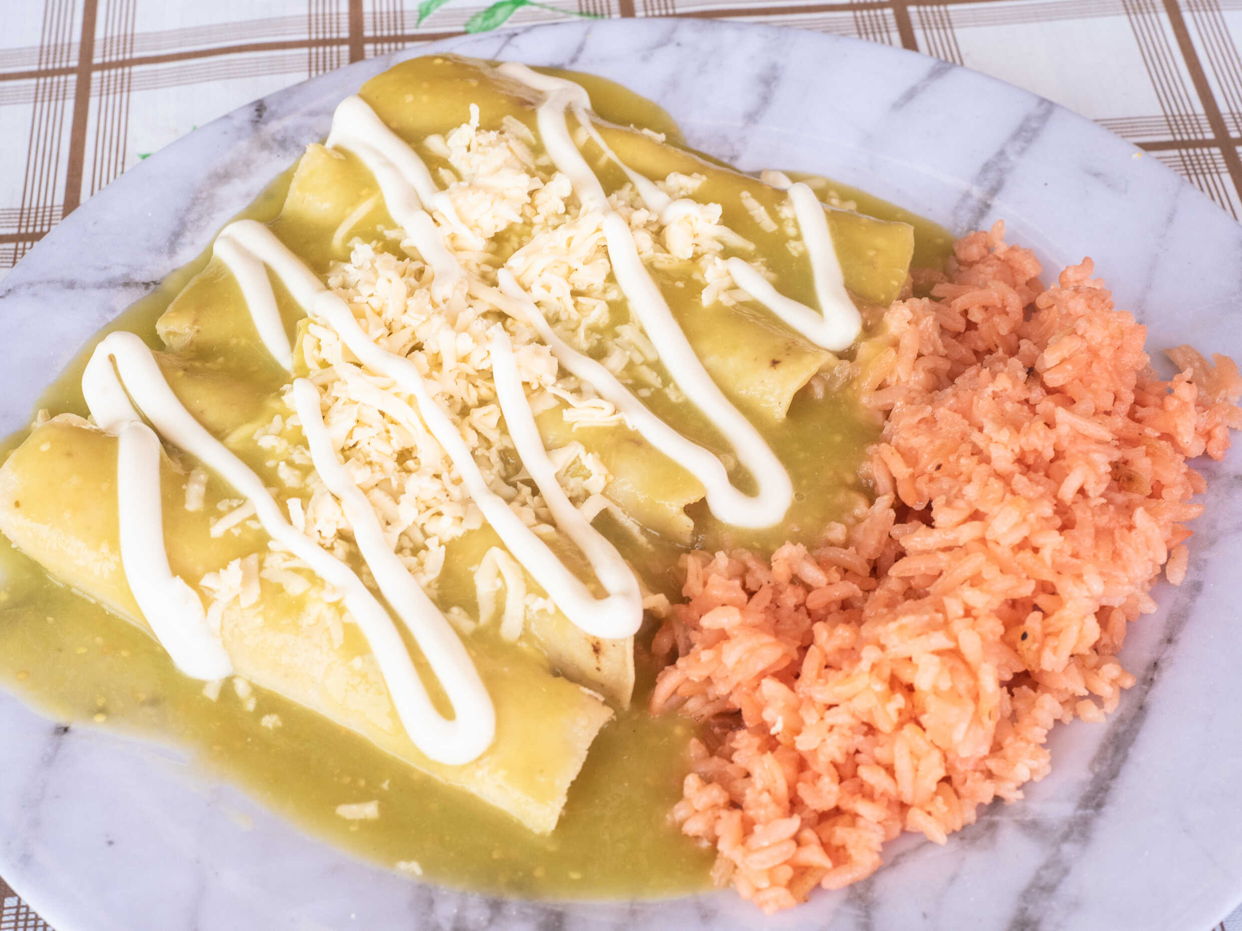 5 Enchiladas de tortilla maíz con pechuga de pollo desmenuzado, salsa verde de la casa, queso chihuahua y dos complementos a elegir