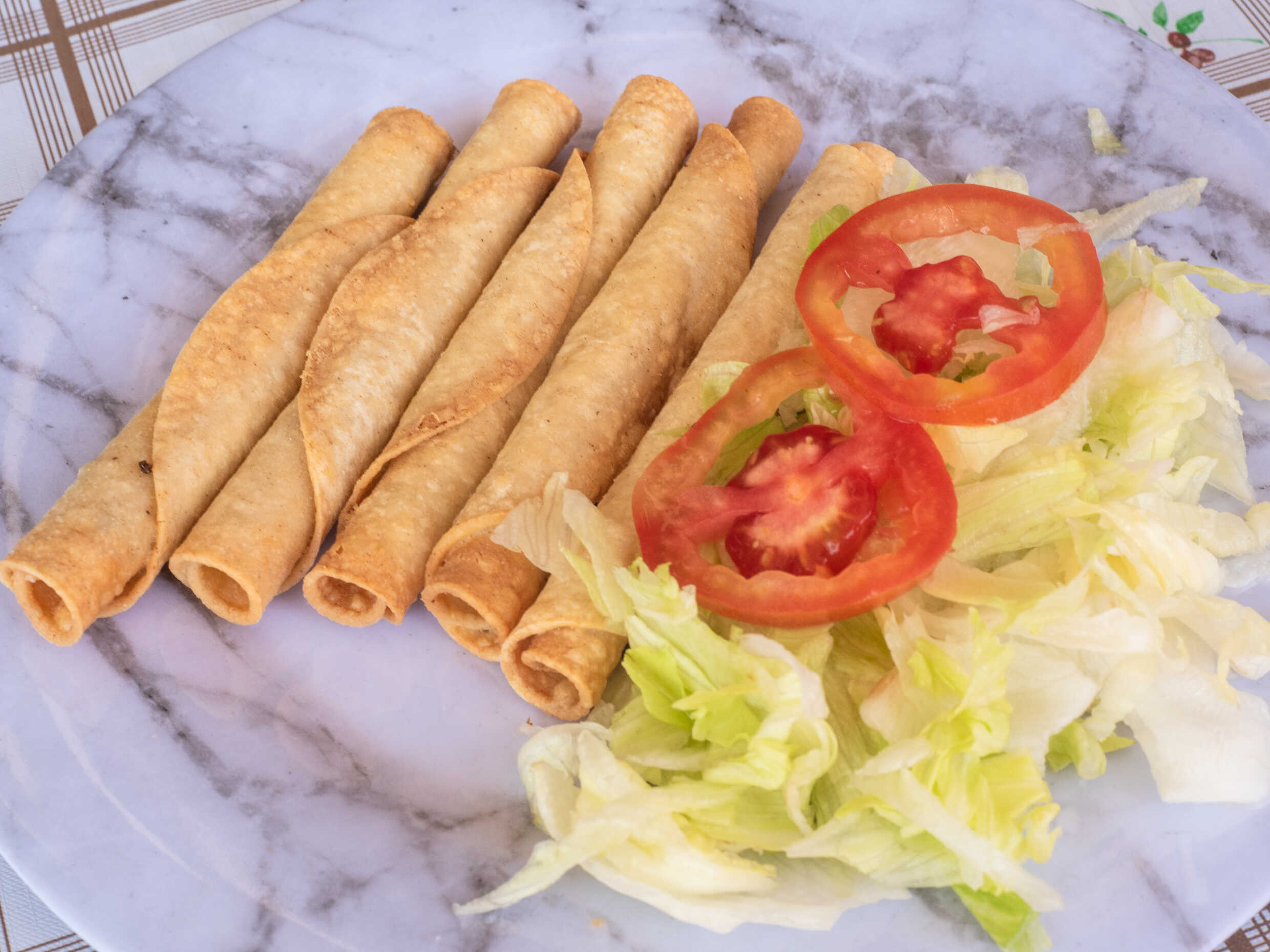 5 Flautas de maíz fritas, rellenas de carne de res deshebrada, acompañadas de papitas cocidas, crema, salsa y 2 complementos a elegir.