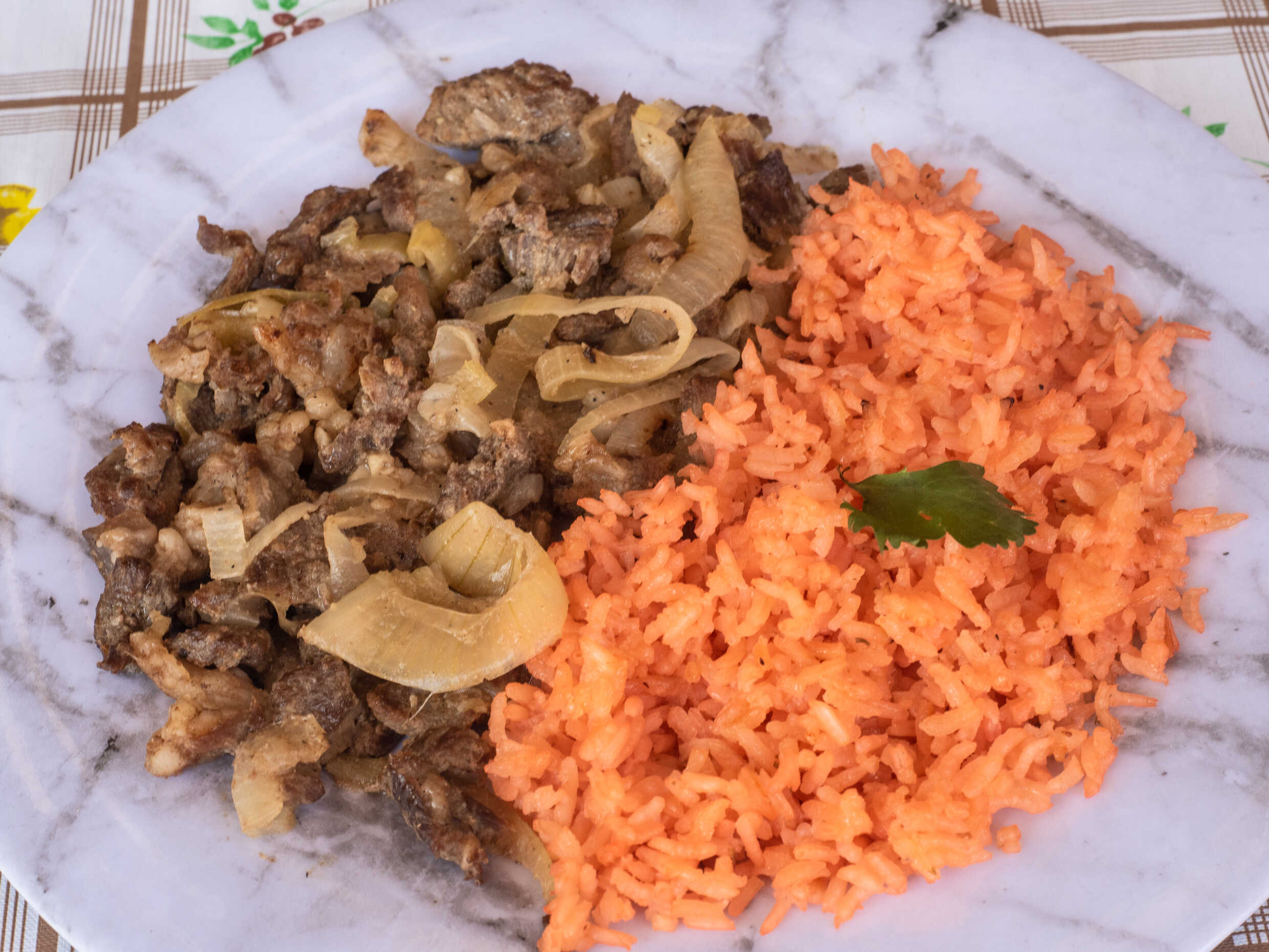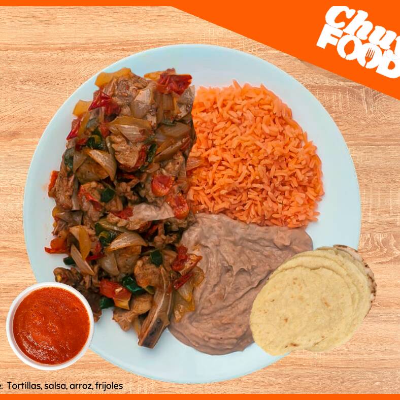 200 gr de bistec de res en trozo asado con cebolla, tortillas de maíz, salsa y 2 complementos a elegir.
