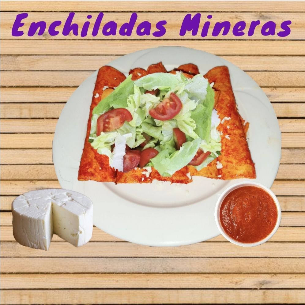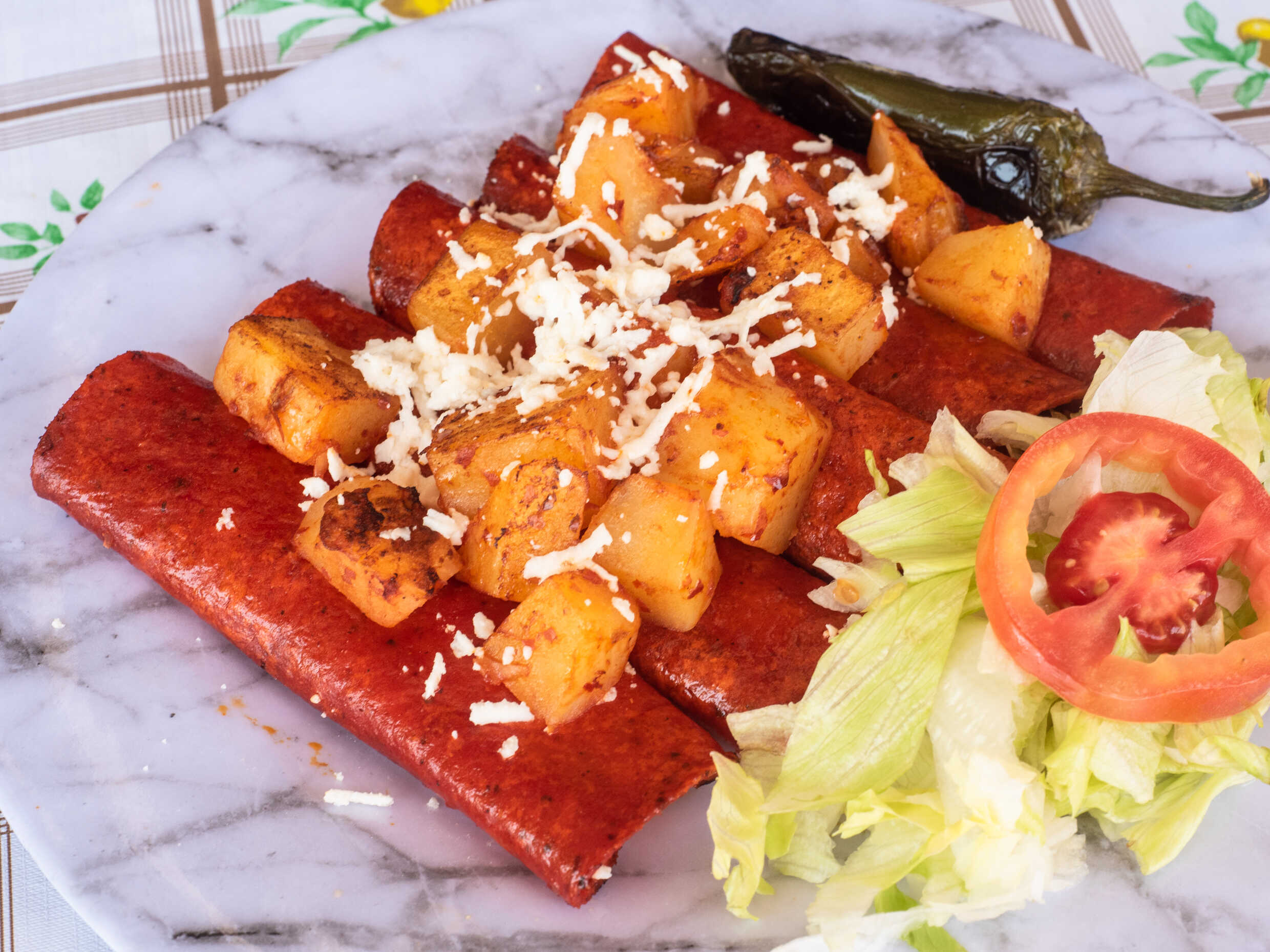 5 Enchiladas de maíz rojas, rellenas de queso panela, acompañadas de papas cocidas, 1 chile toreado y 2 complementos a elegir.
