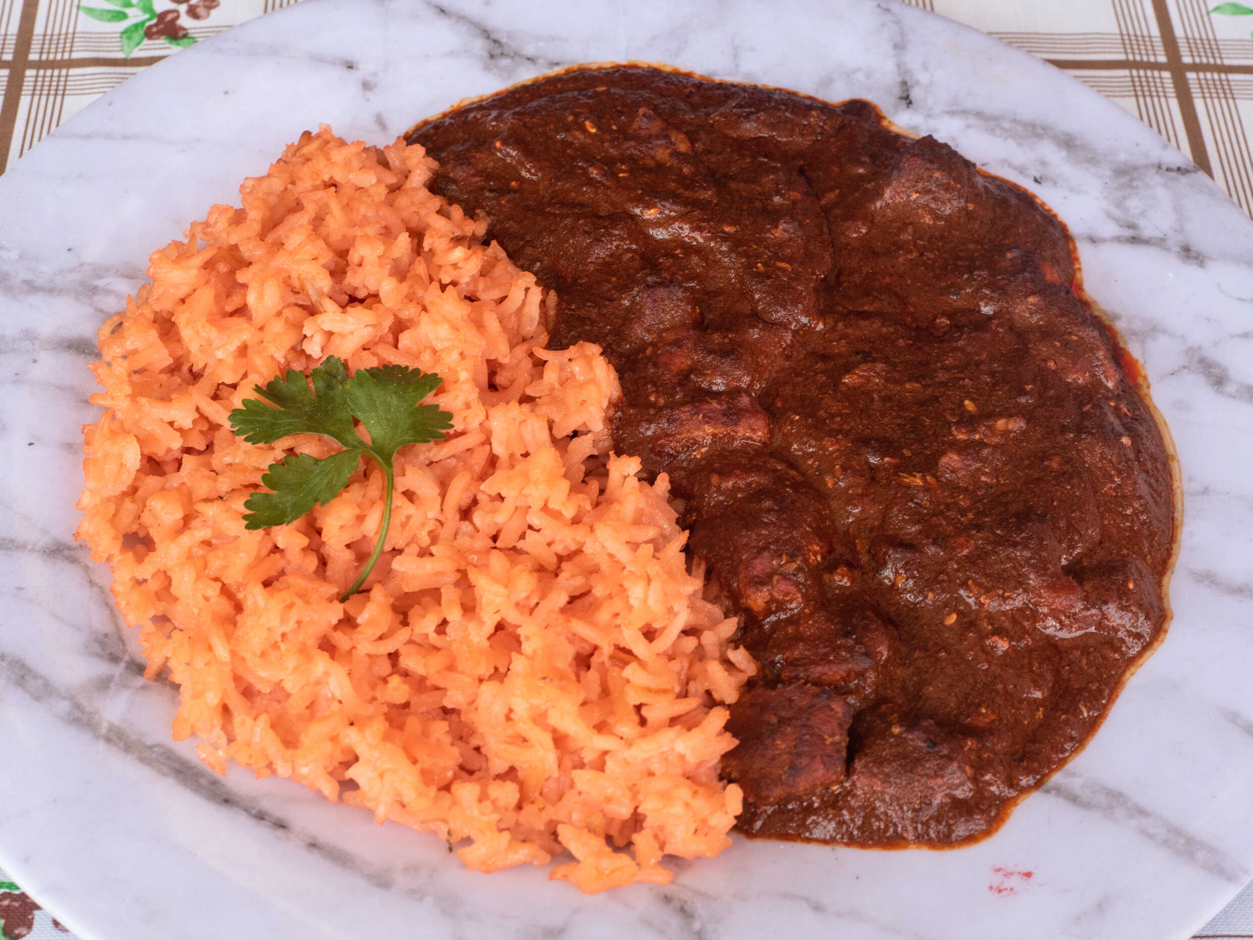 180 gr de carne a tu elección, con mole Artesanal dulce rojo, Complementos a elegir, 4 tortillas de maíz y salsa de la casa.