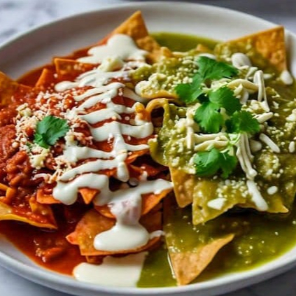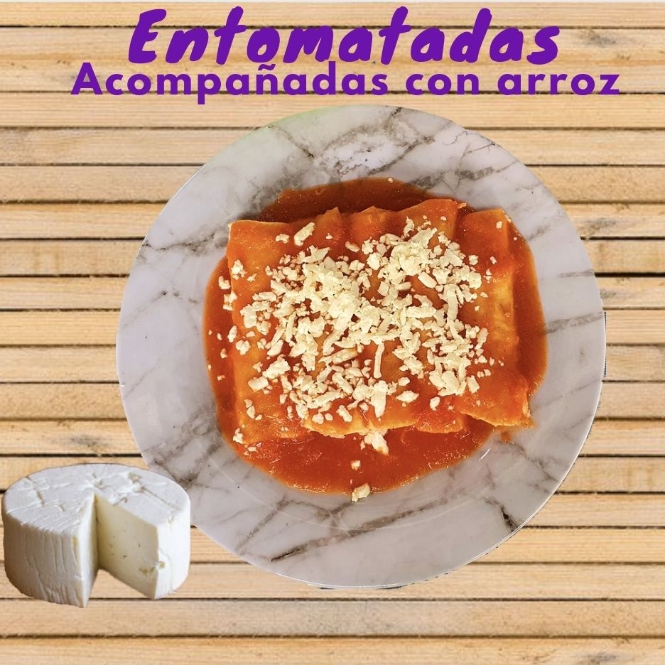 5 Tortillas de maíz con queso panela, bañadas en salsa de tomate, salsa casera y 2 complementos a elegir.