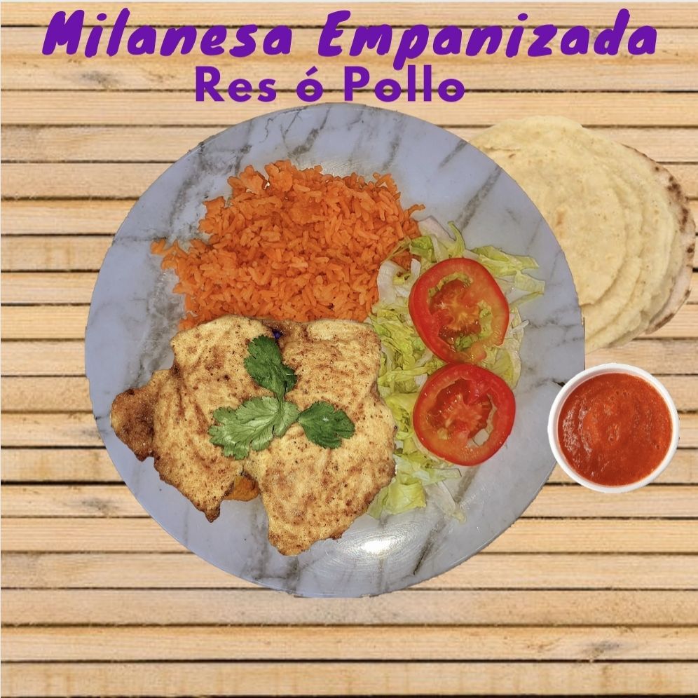 1 Milanesa de RES empanizada, 4 tortillas de maíz y salsa de la casa, 2 complementos a elegir
