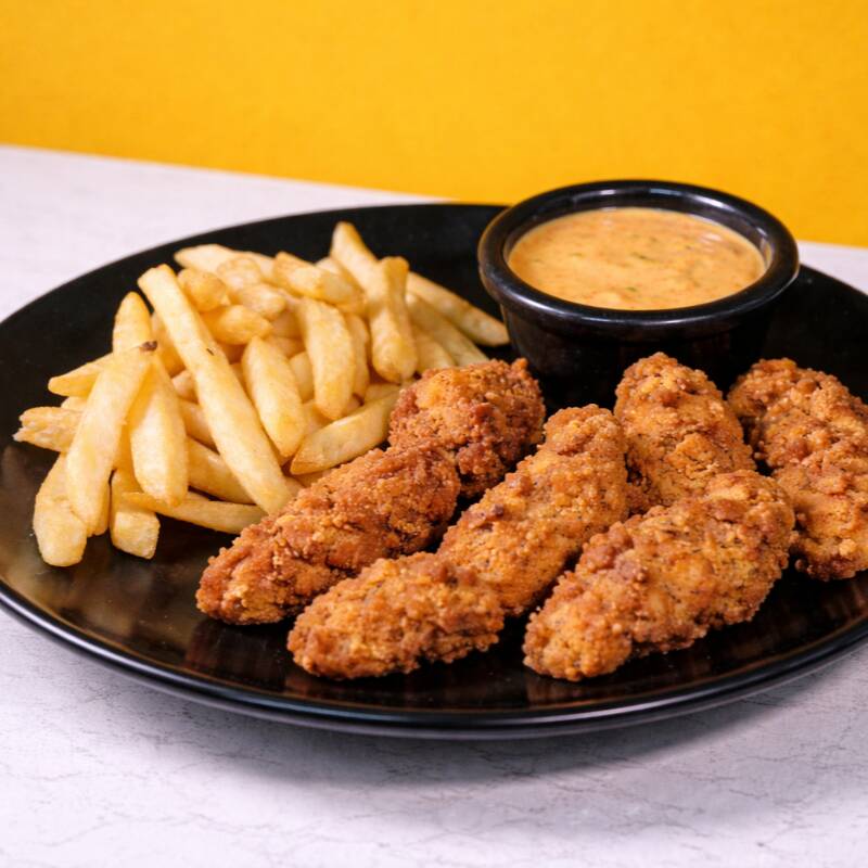 Tiras de pollo empanizado, acompañadas de papas a la francesa, y 1 aderezo a escoger