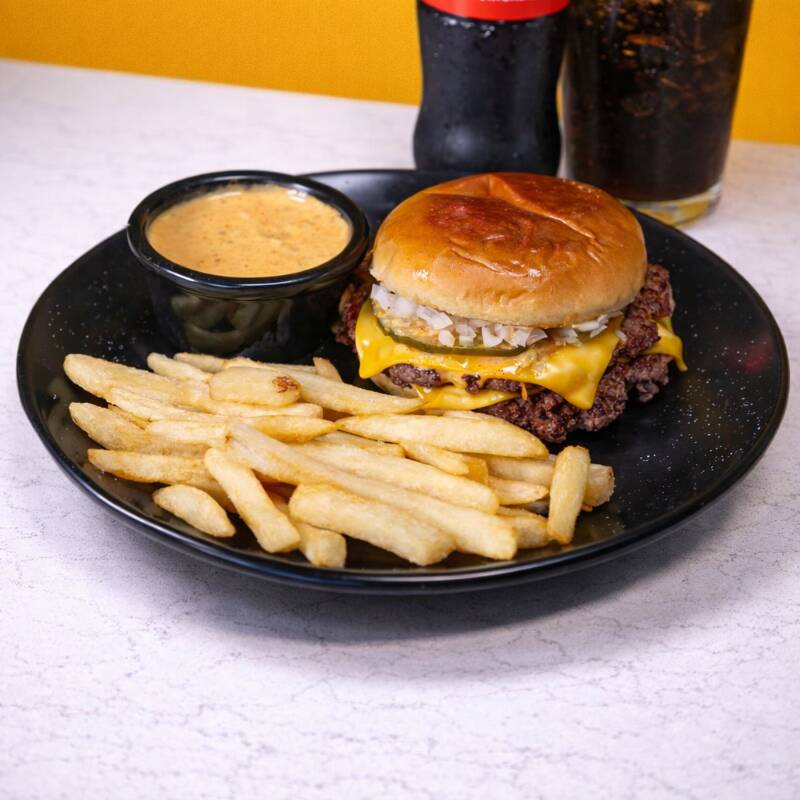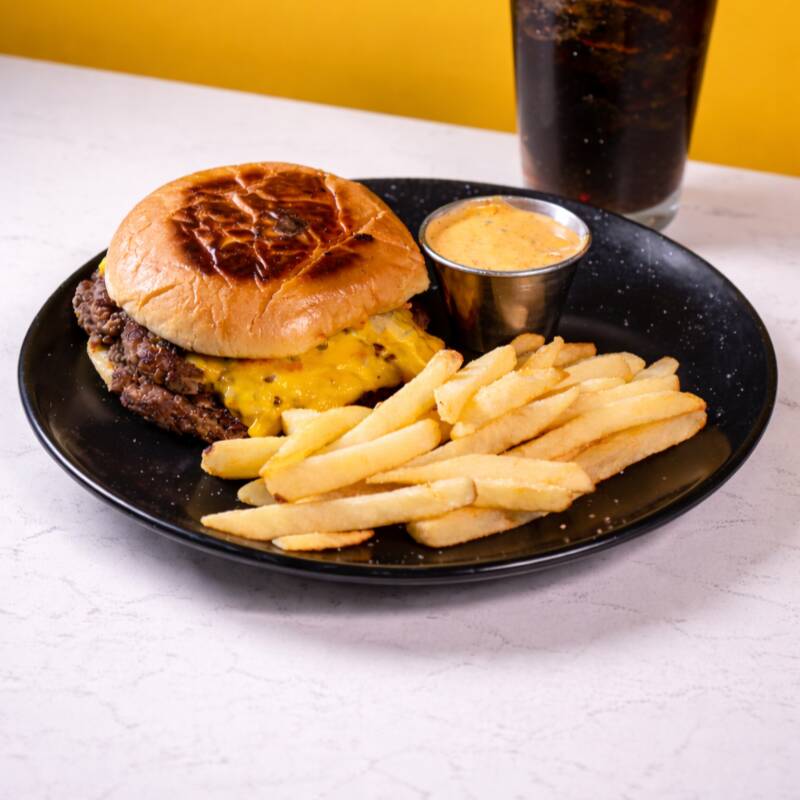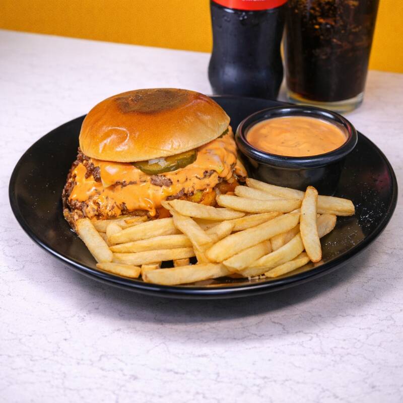 2 carnes smash burguer 100% de res, queso americano, aderezo de la casa, pepinillos y cebolla, acompañada de papas a la francesa