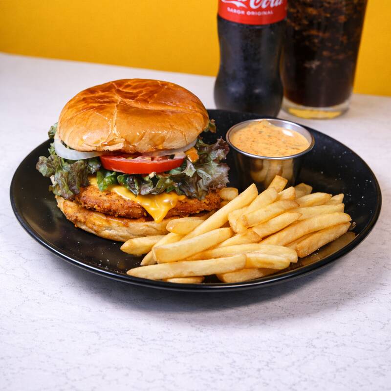Pollo empanizado, queso americano, lechuga, tomate y aderezo lemon pepper, acompañada de papas a la francesa