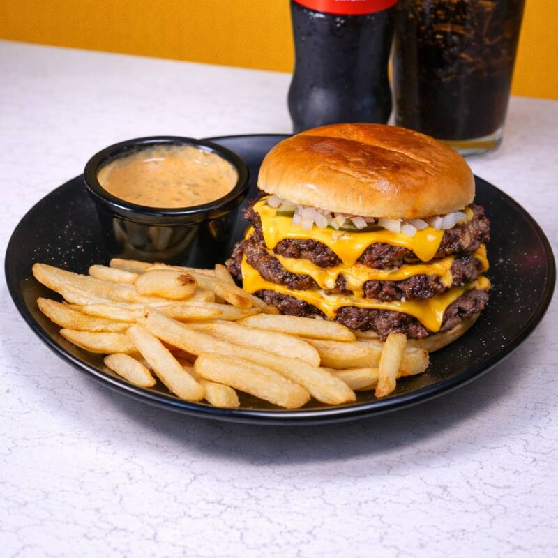 3 carnes smash burguer 100% de res, queso americano, aderezo de la casa, pepinillos y cebolla, acompañada de papas a la francesa