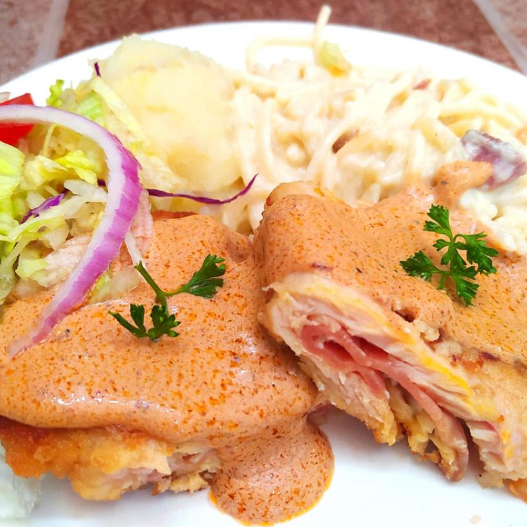 ( Para una persona ) Pechuga de pollo(200 - 250 gramos empanizada rellena de jamón y queso asadero acompañada de 2 guarniciones a elegir (Puré y spaghetti o arroz y frijoles), ensalada de lechuga con tomate, cebolla, pepino, salsa por aparte., chile serrano y tomate.