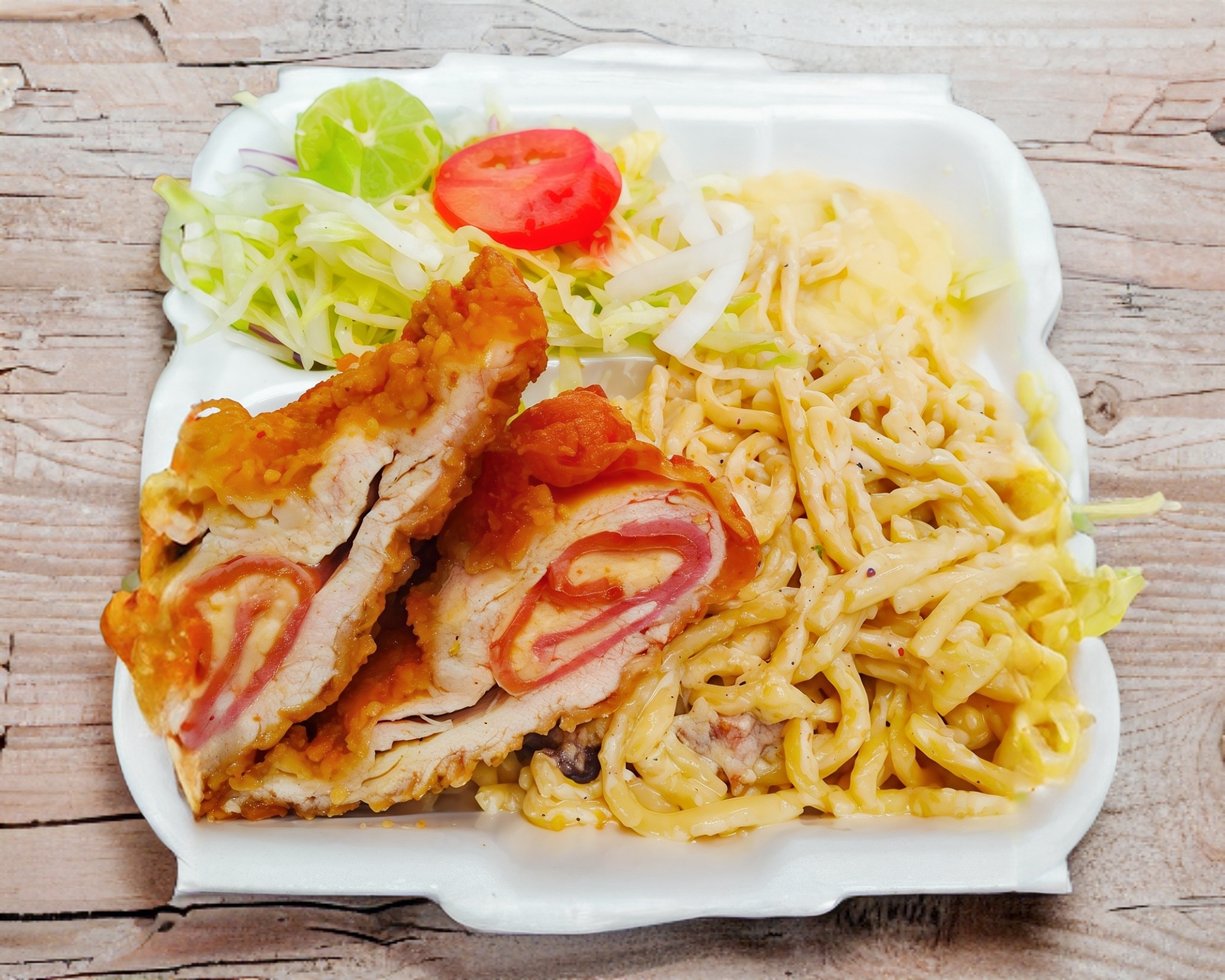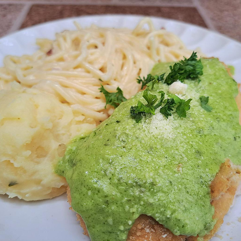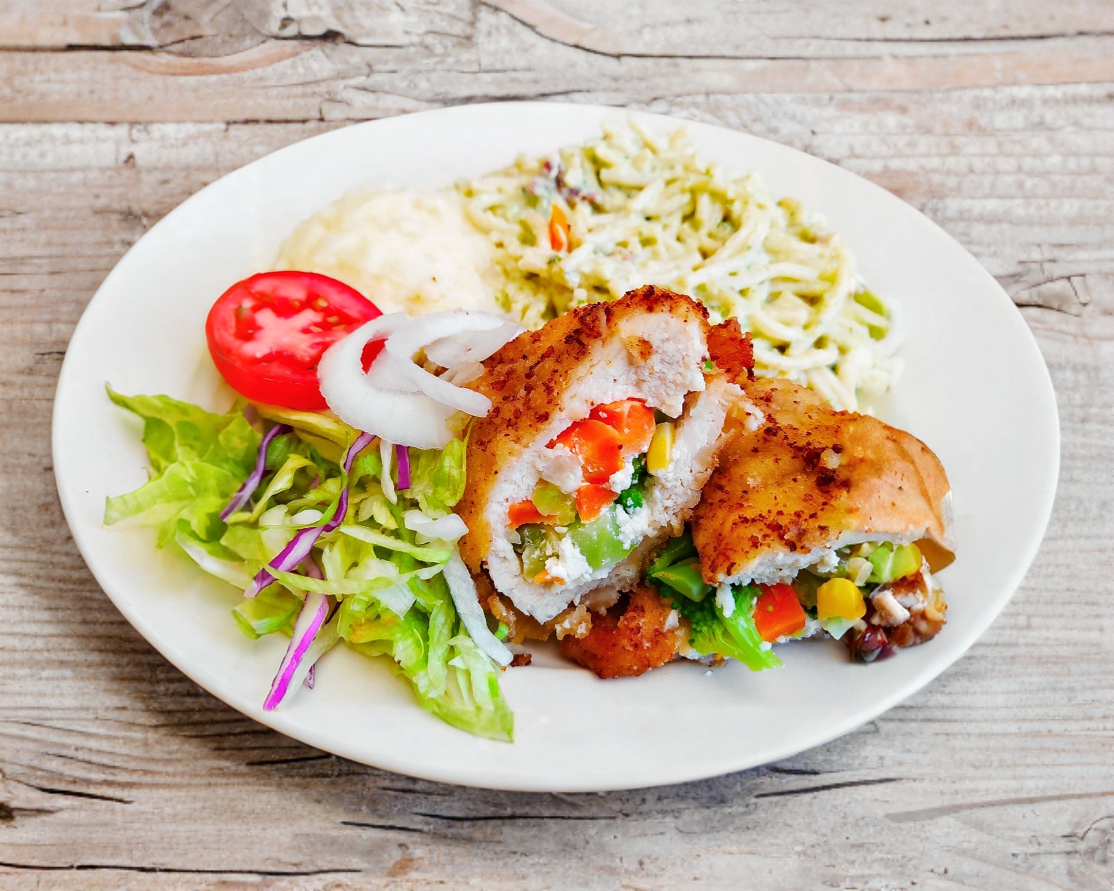 Pechuga de pollo empanizada rellena de verduras y Philadelphia acompañada de 2 guarniciones a elegir (Puré y spaghetti o arroz y frijoles), ensalada de lechuga.