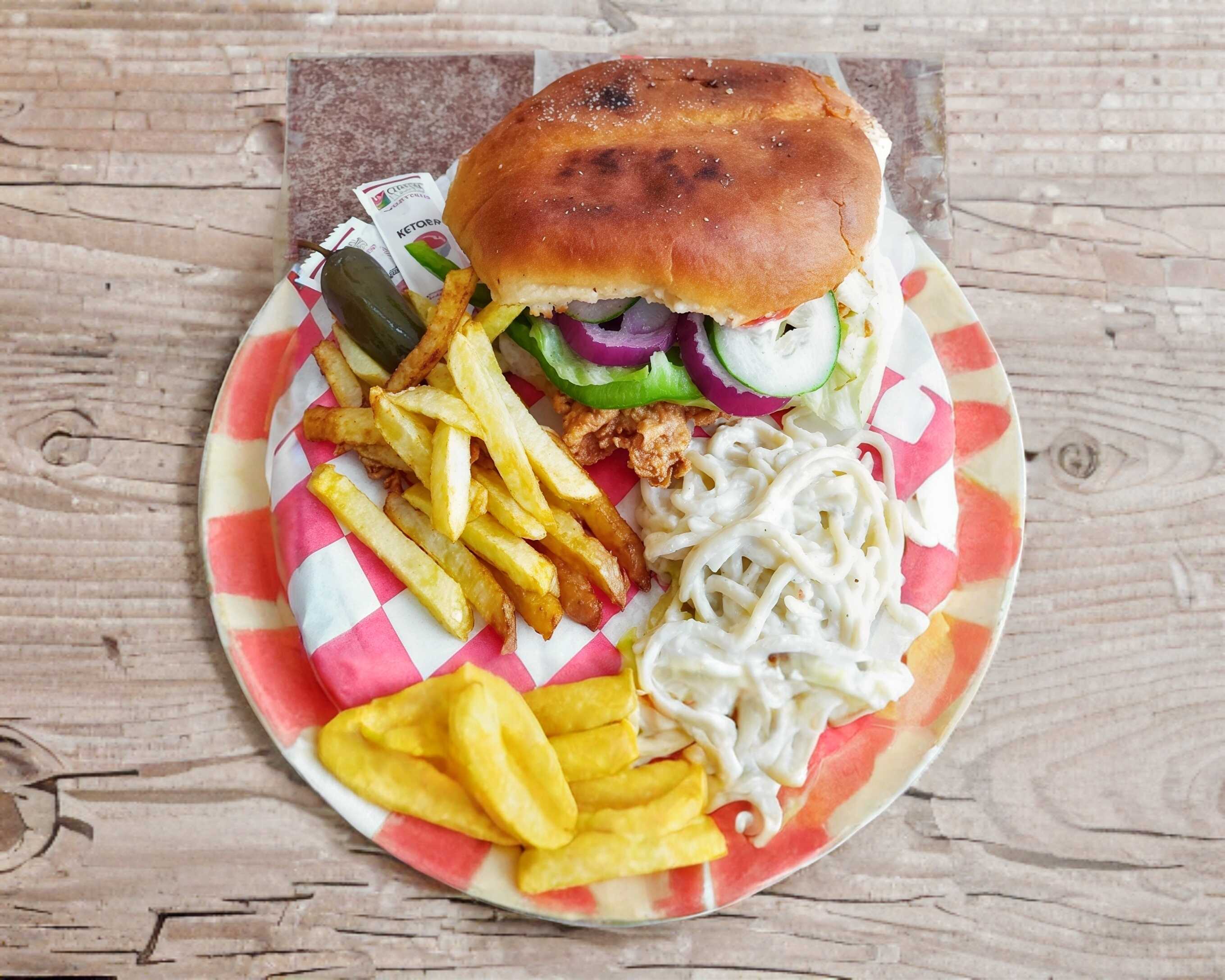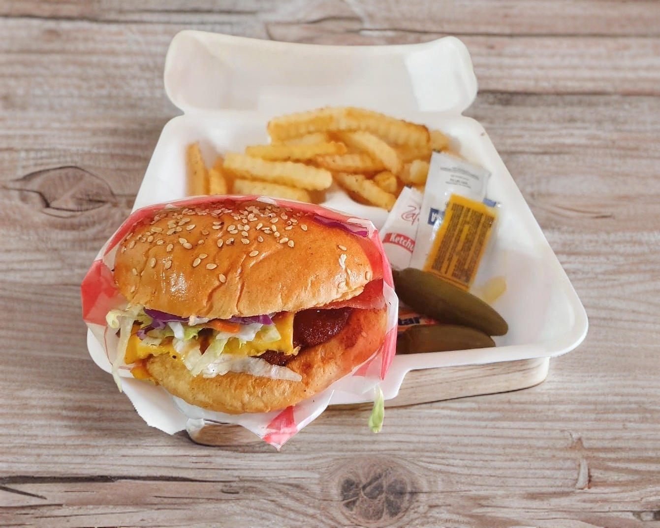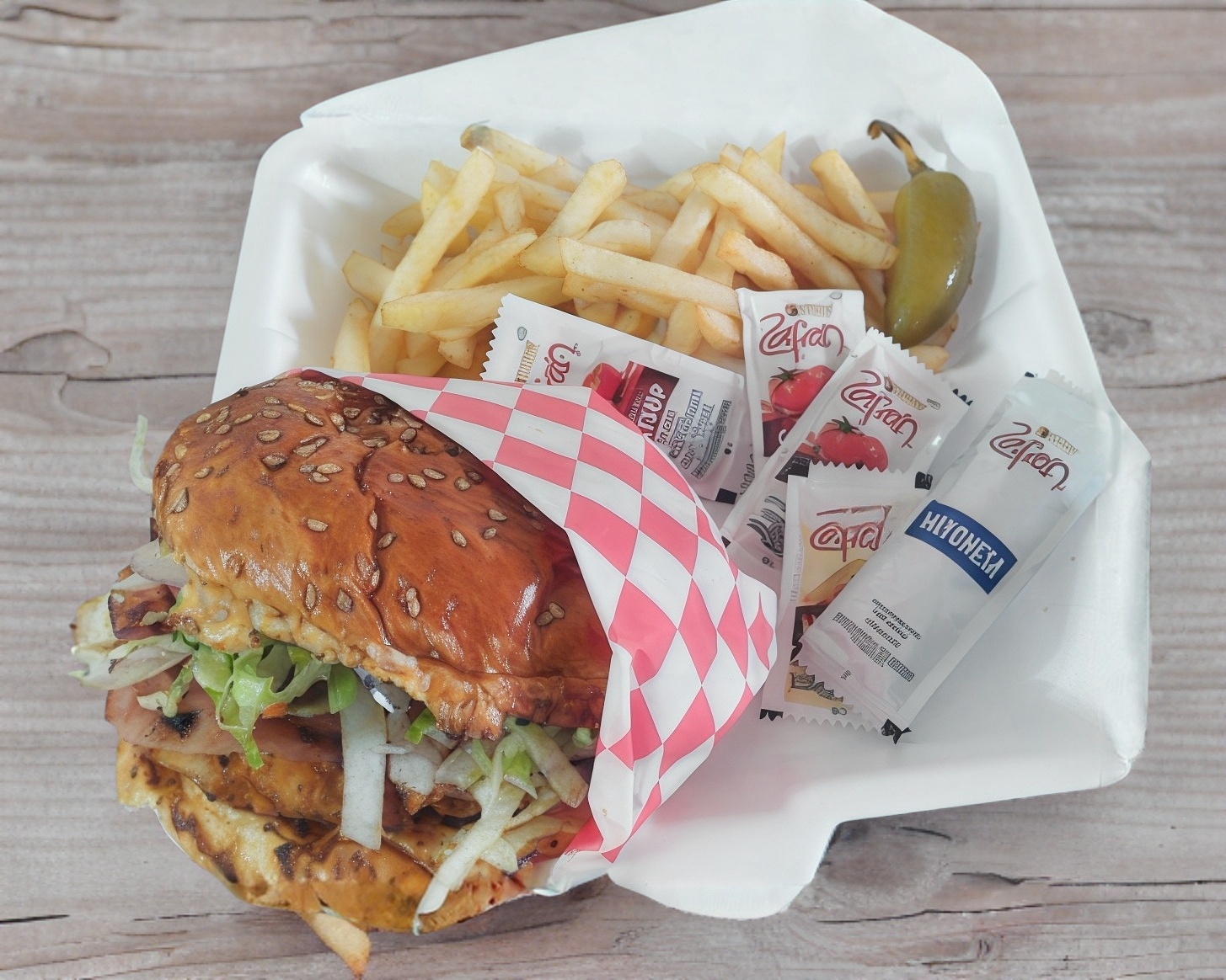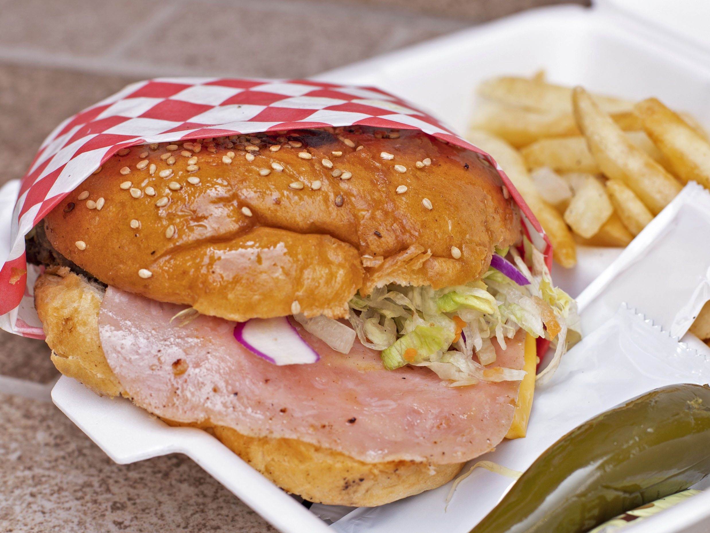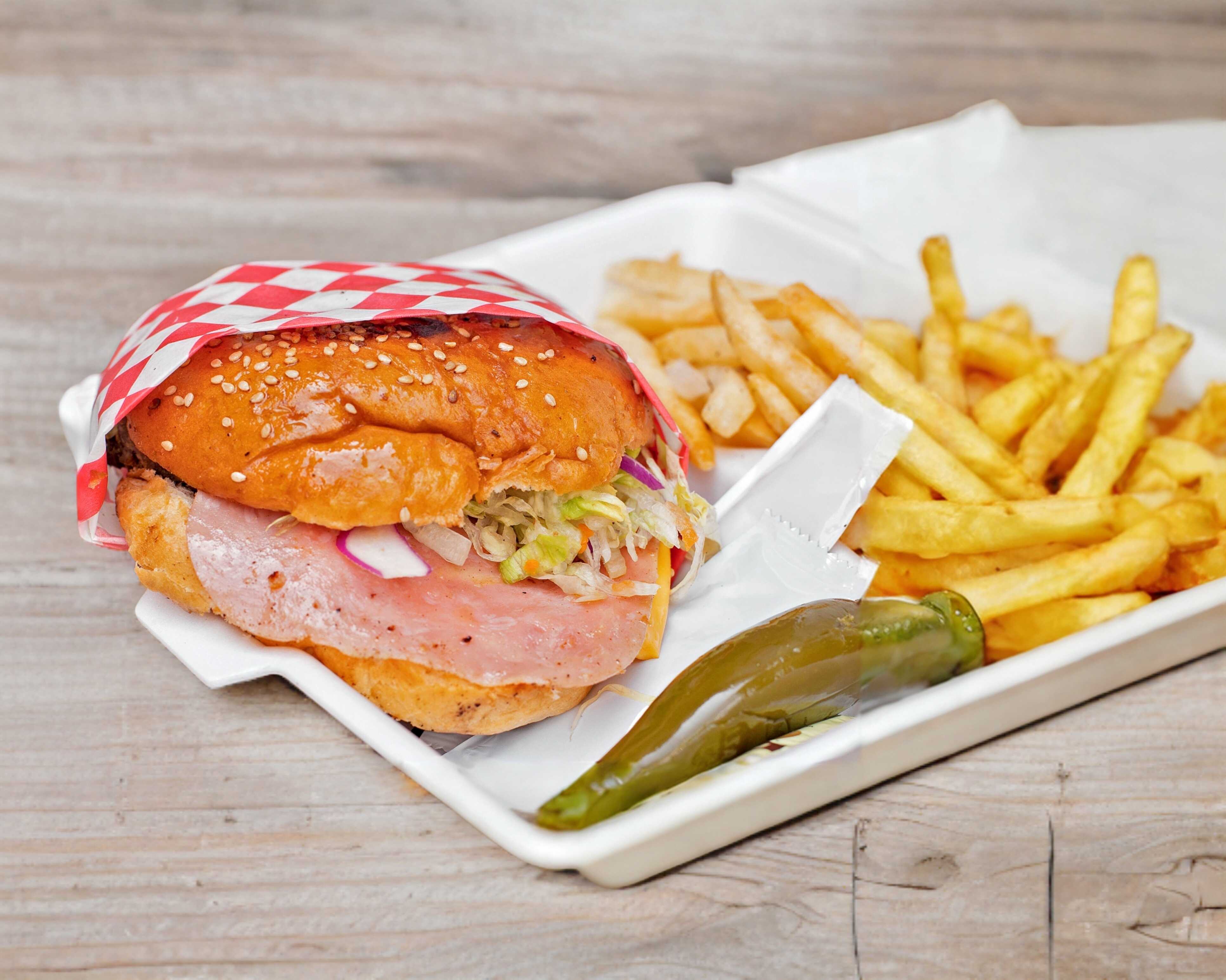 Carne de res, jamón, queso americano, tomate, cebolla y lechuga, incluye chile en vinagre y aderezos. Acompañada de papas fritas.
