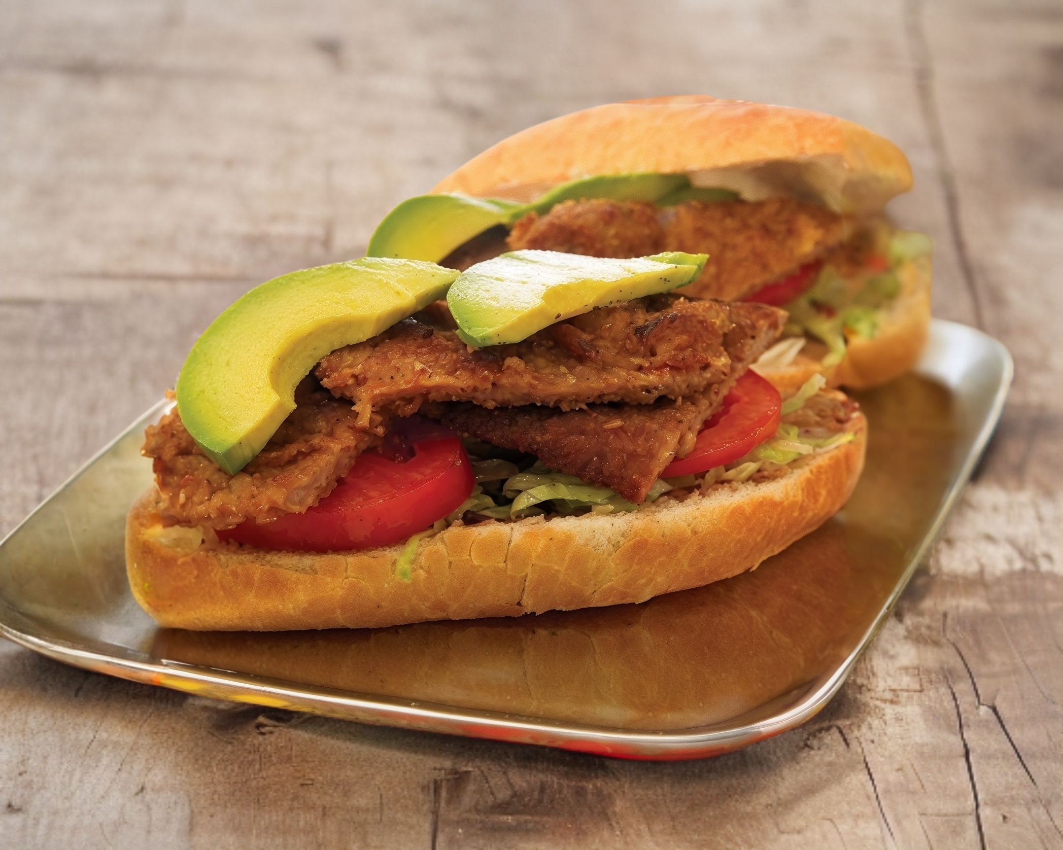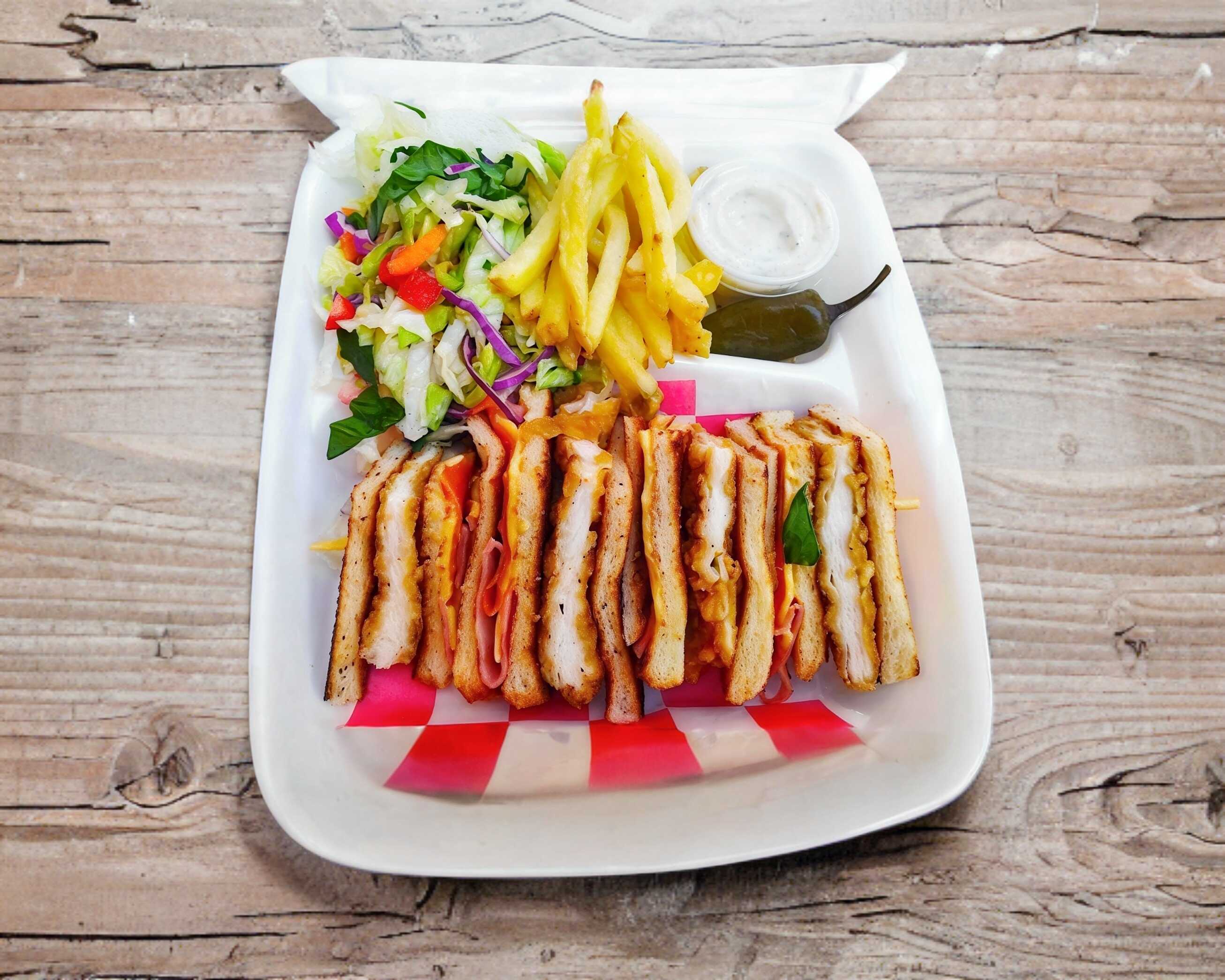 Carne de res casera, pechuga de pollo empanizada (Bañada en salsa de tu elección BBQ, buffalo, mango-habanero), jamón, queso americano, lechuga ,tomate, cebolla y pan artesanal, incluye papas fritas y adertezos