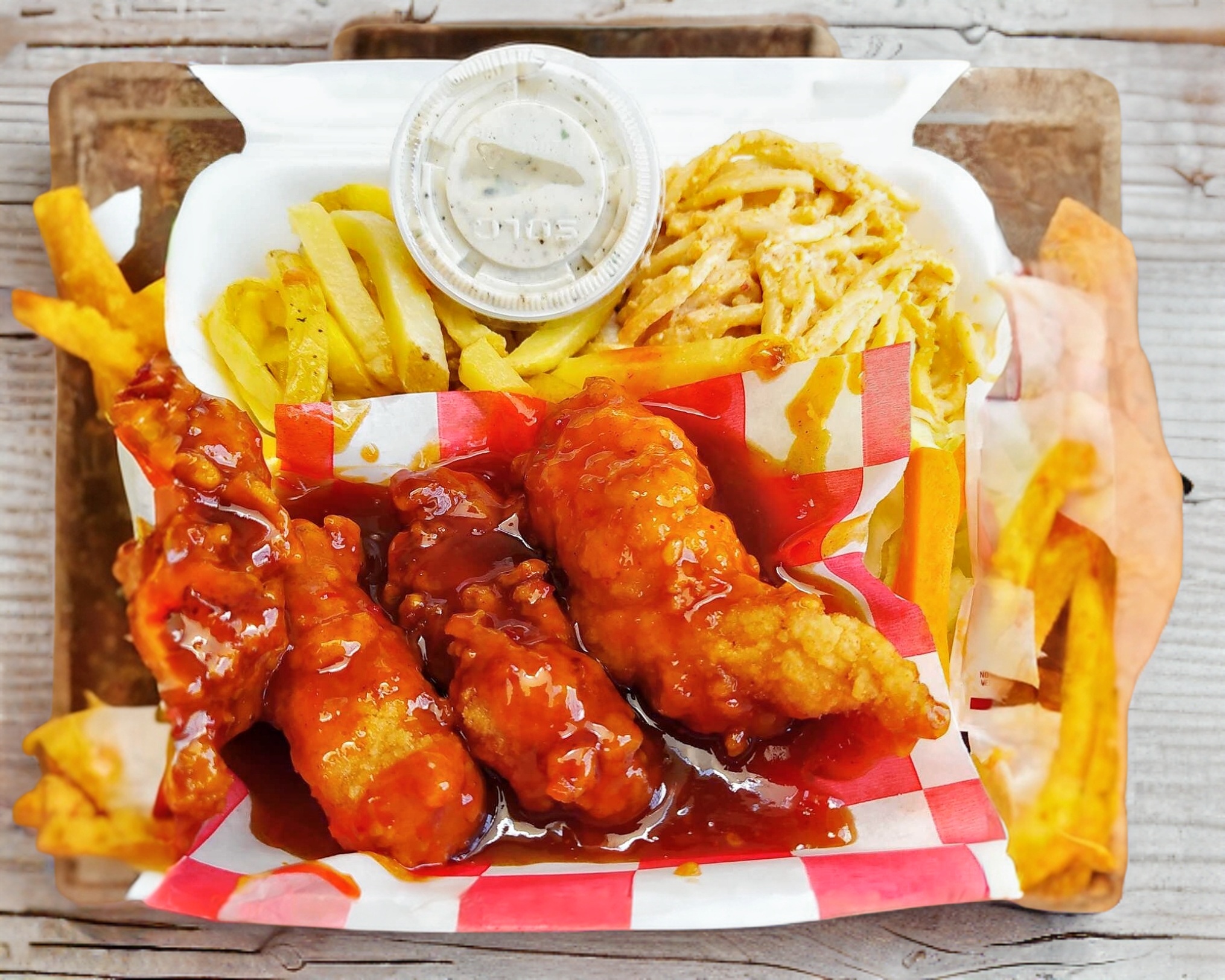 Orden de 3 a 4 piezas. Tenders de pollo bañados en salsa de su elección acompañados de papas a la francesa, apio, zanahoria y aderezo de la casa.