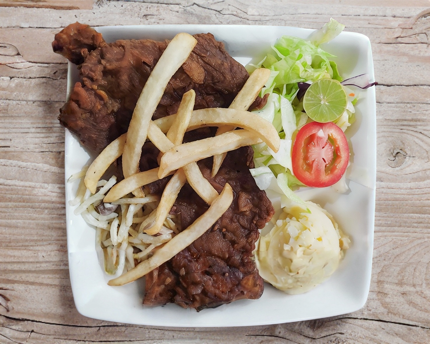 Carne de res casera, piña, jamón, queso amefricano, lechuga, tomate, cebolla y pan artesanal, incluye papas fritas y aderezos
