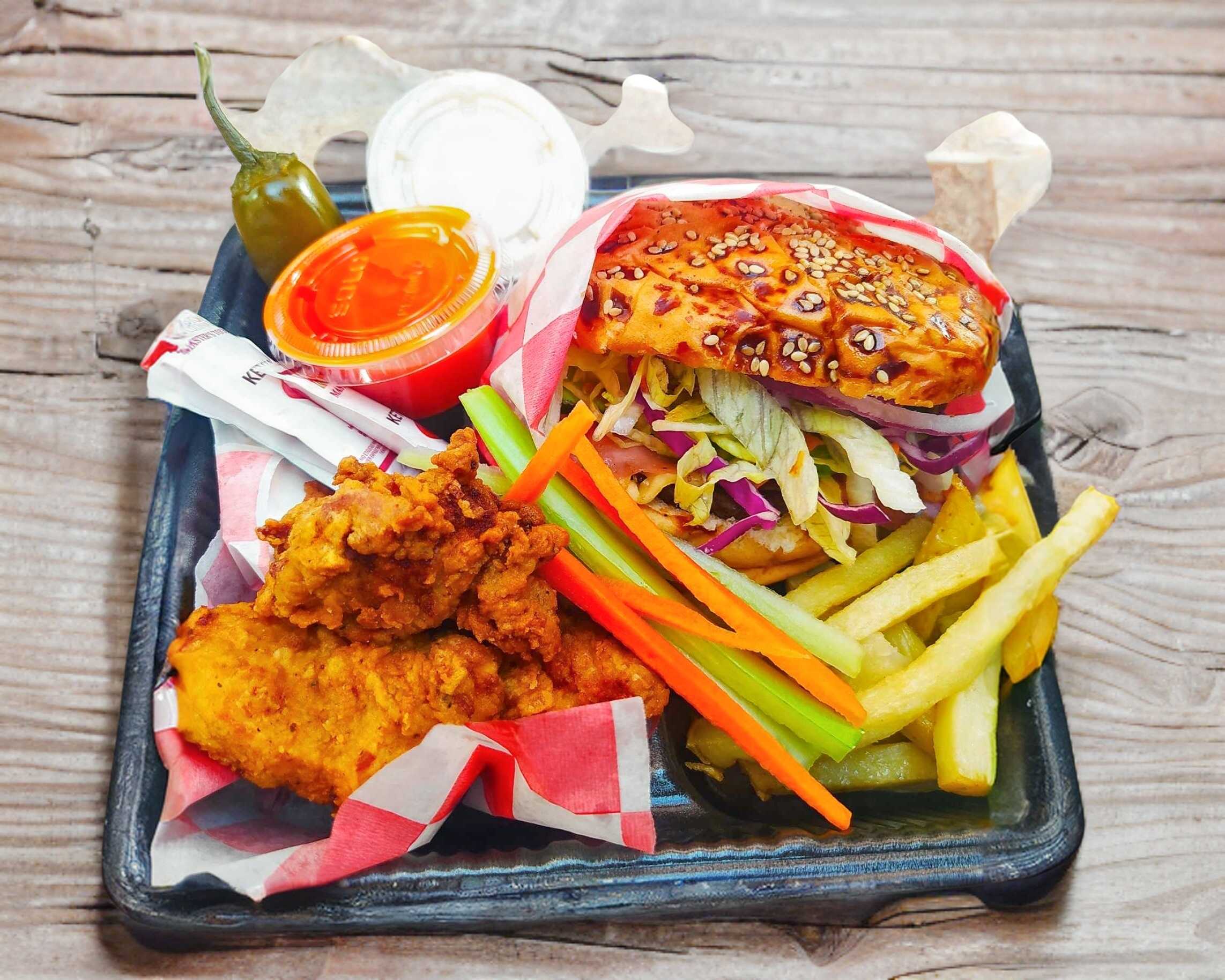 Incluye una hamburguesa especial, chile en vinagre, papas fritas, 3 boneless, 1 salsa, aderezo y verduras stick