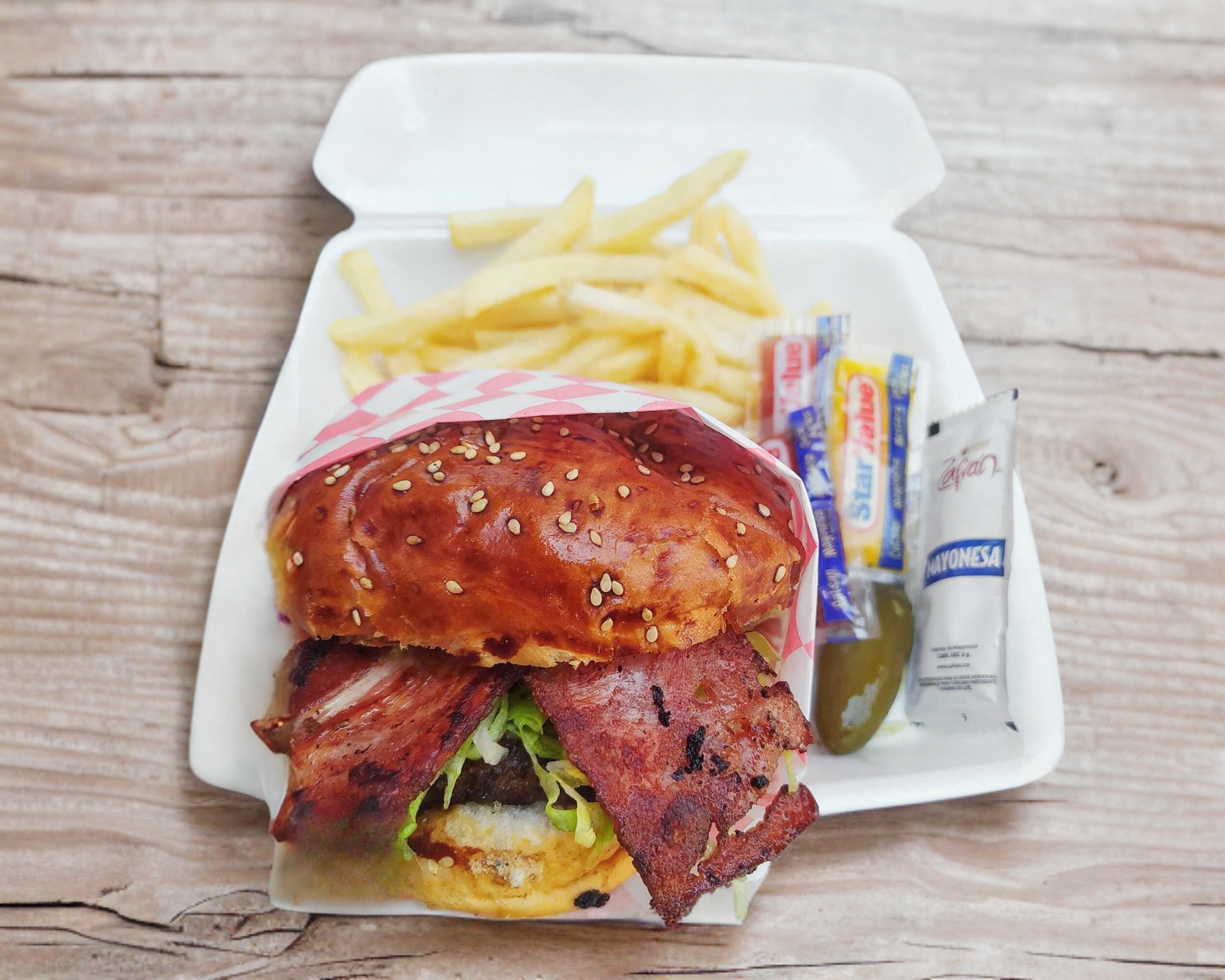 Hamburguesa especial de res con jamón, queso americano, queso manchego, 2 tiras de rico tocino, lechuga, tomate y cebolla, acompañada de papas fritas.