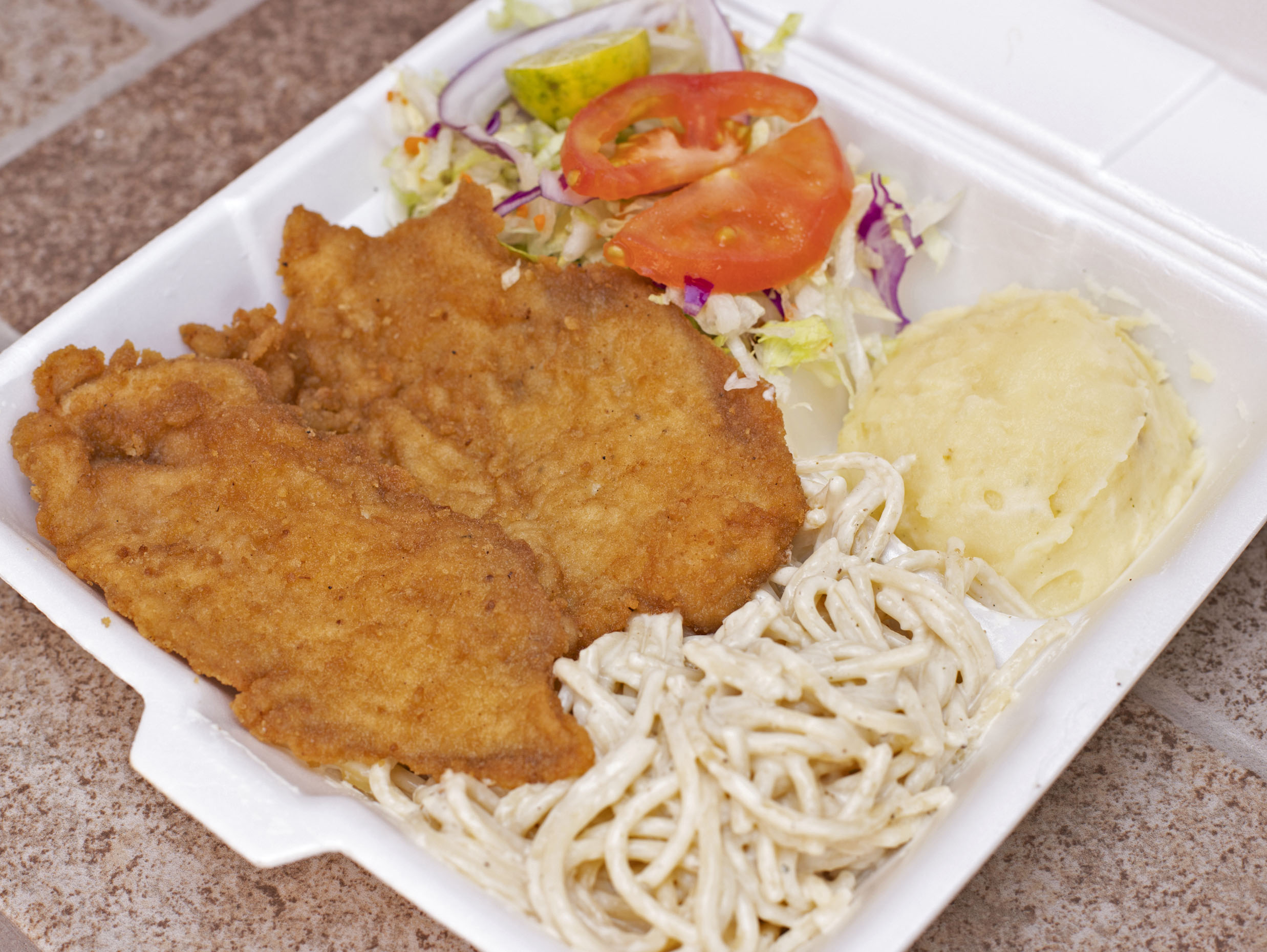 Milanesa de pollo empanizada acompañada de 2 guarniciones a elegir (Puré y spaghetti o arroz y frijoles), ensalada de lechuga.