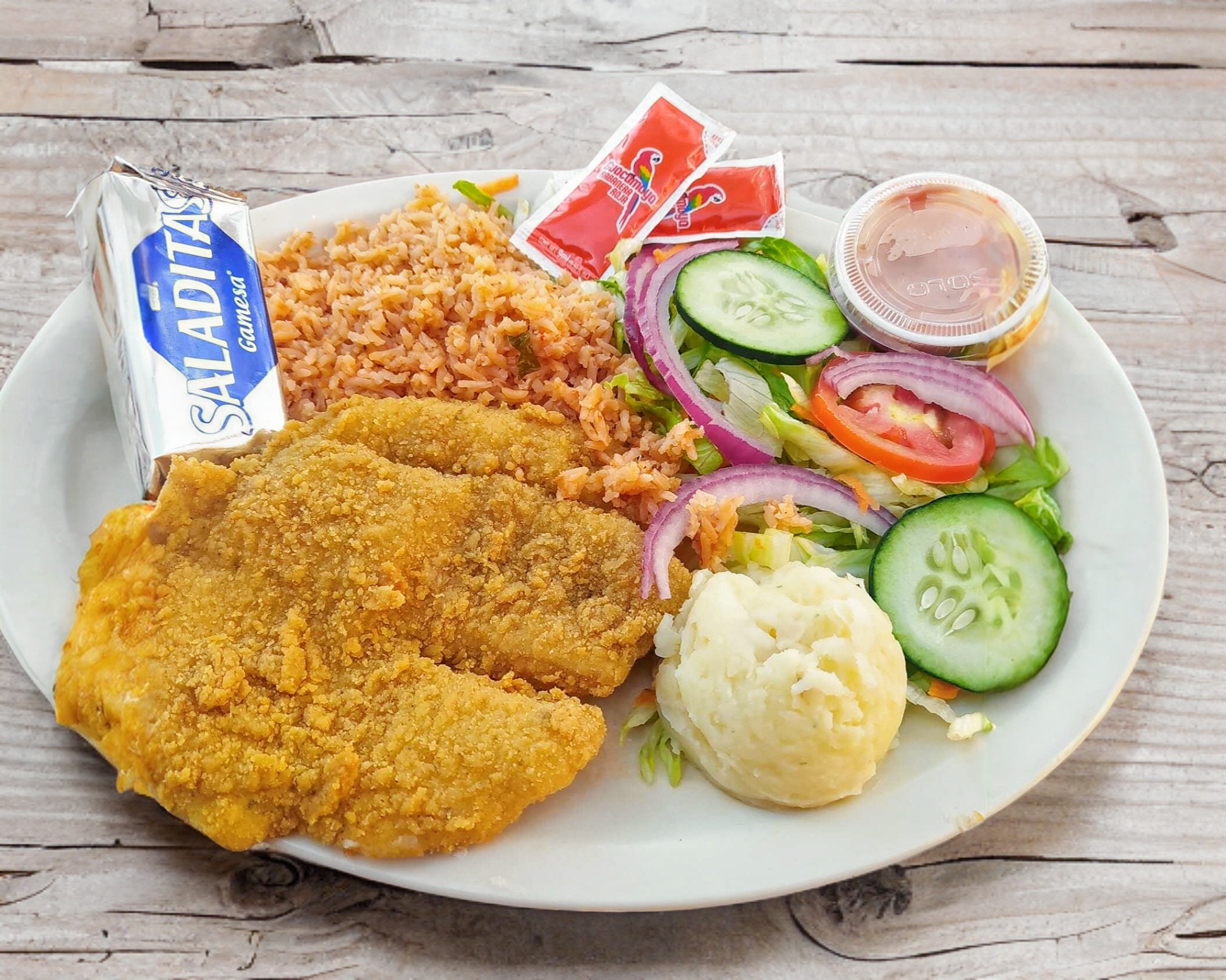 1 porcion persona sola Milanesa de pollo (200 a 250 gramos) empanizada acompañada de 2 guarniciones a elegir (Puré y spaghetti o arroz y frijoles), ensalada de lechuga tomate limon y pepino salsa picante y 5 tortillas de harina de maiz