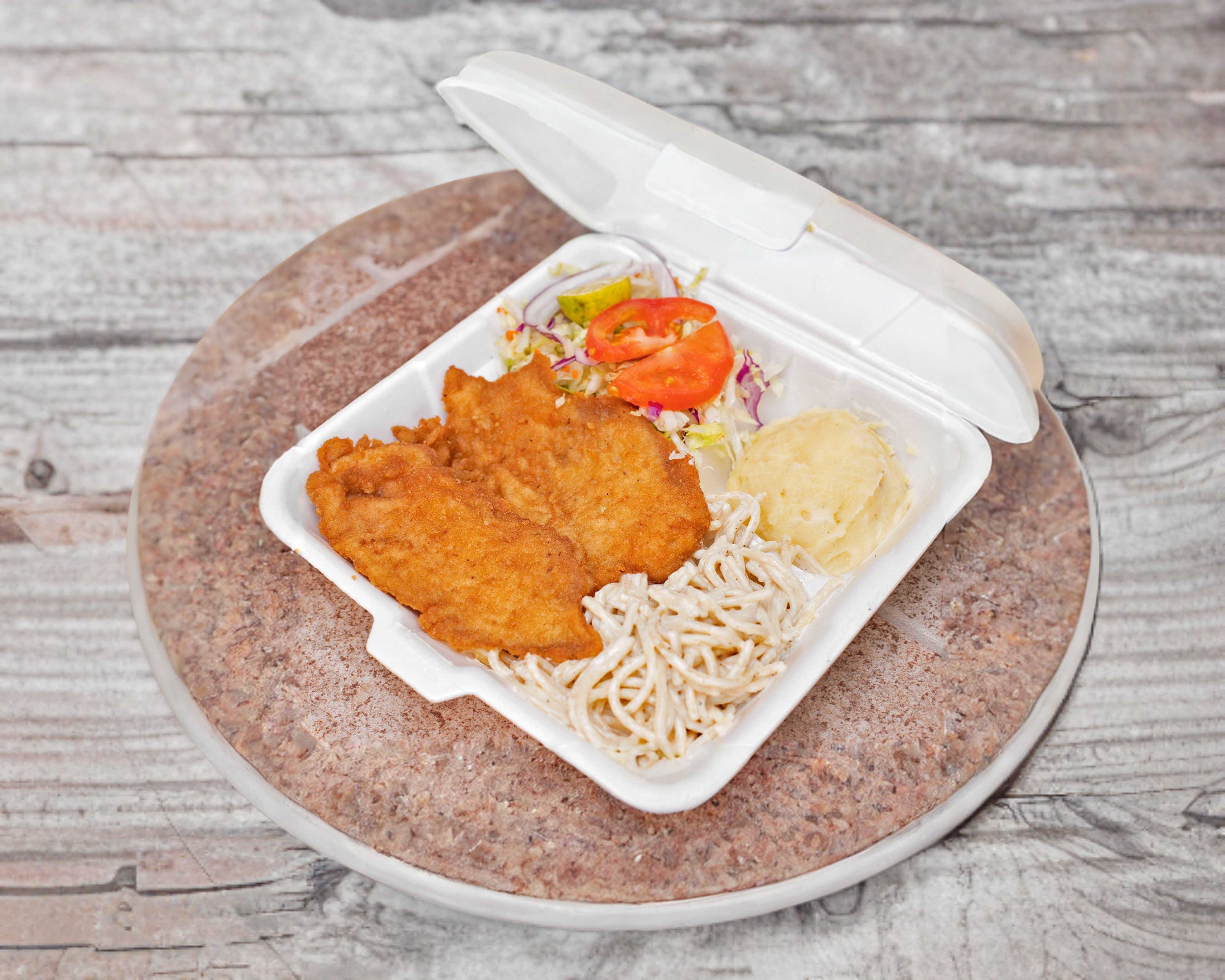 Filete de pescado empanizado, acompañado de 2 guarniciones a elegir (Puré y spaghetti o arroz y frijoles), ensalada de lechuga.