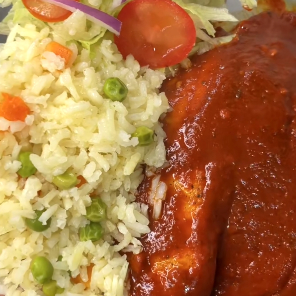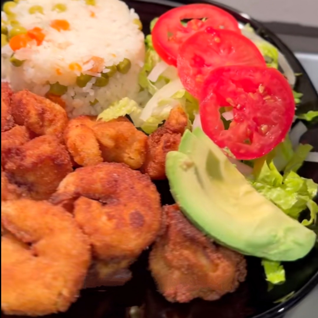 acompañados de arroz, papas a la francesa , ensalada y aguacate