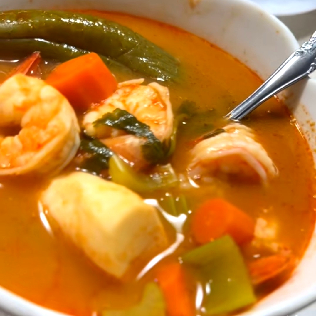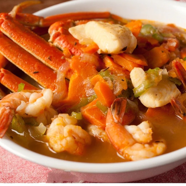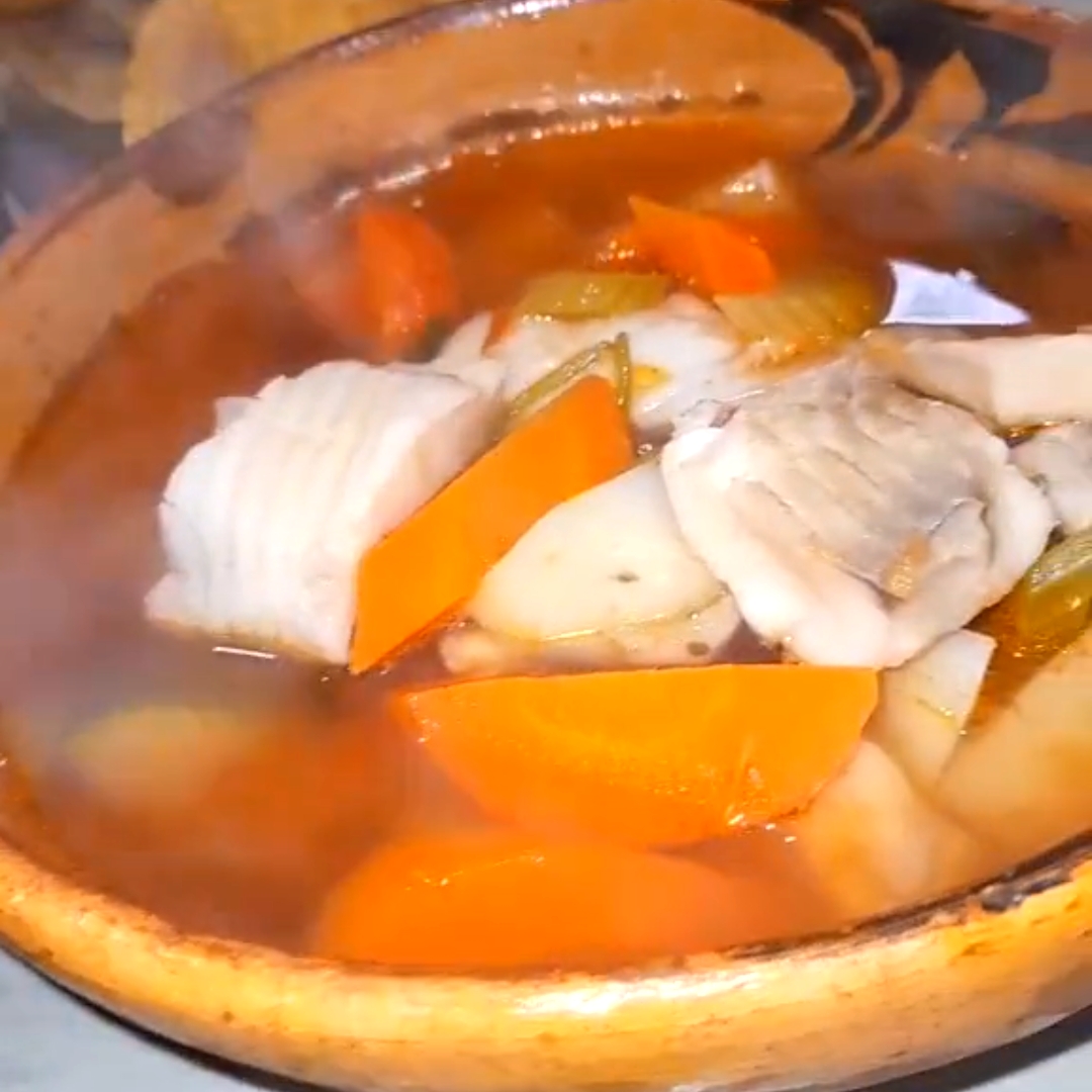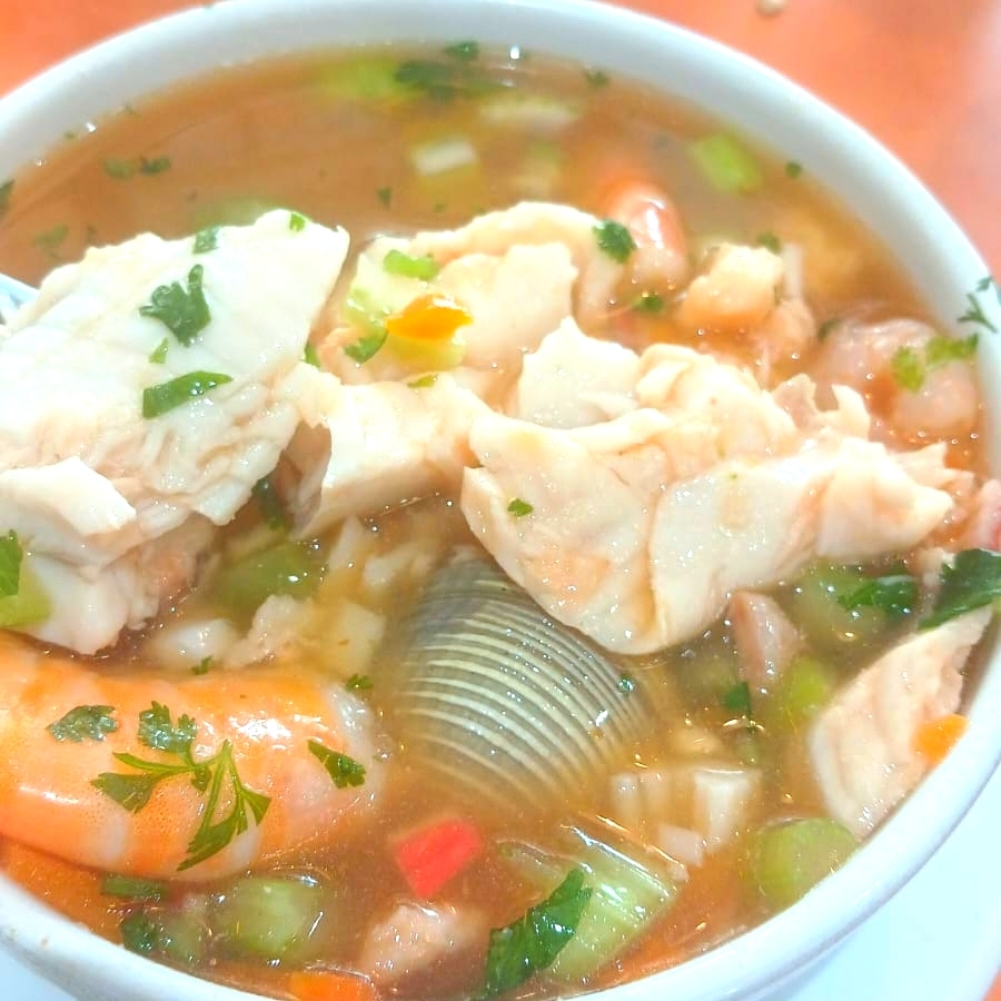 Litro de consomé con Pescado Tilapia, pulpo, camarón, surimi, jaiba