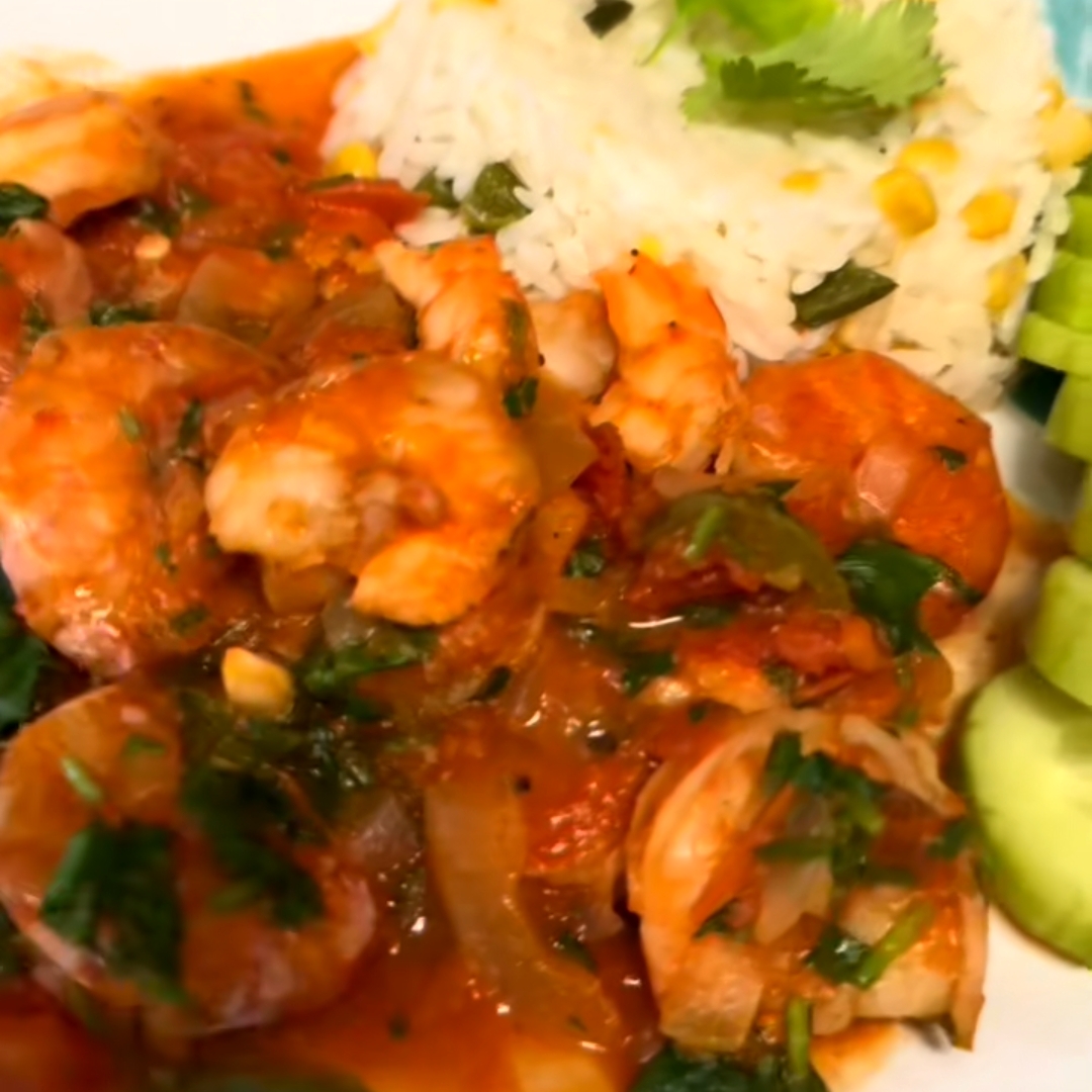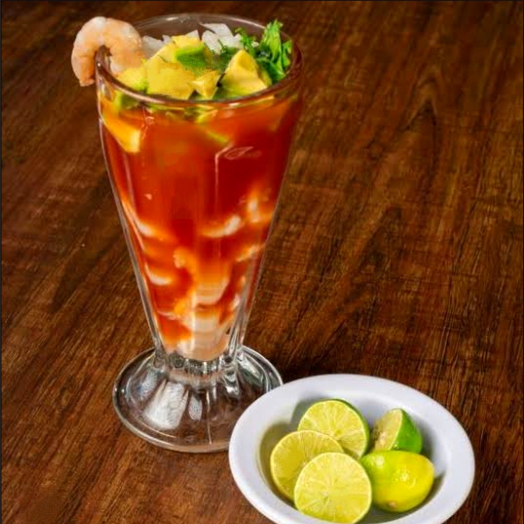 Camarón cocido, pico de gallo y aguacate,galletas,,salsas