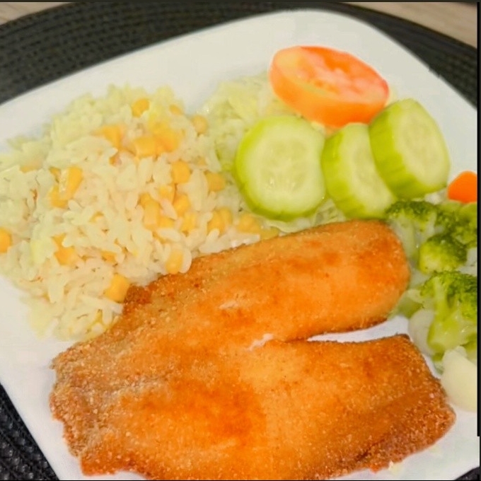 Filete tilapia empanizado, con arroz, papas a la francesa y ensalada